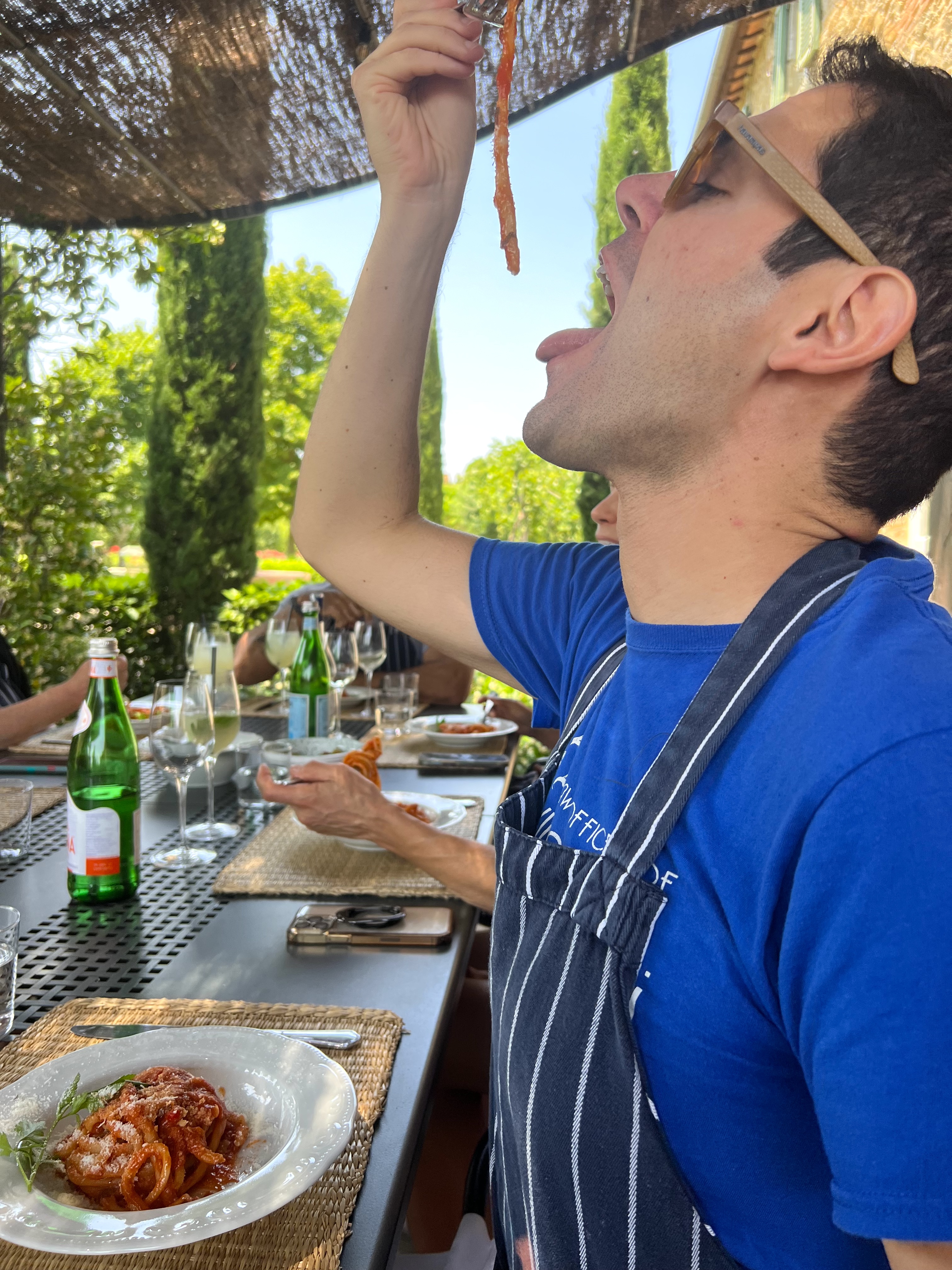 Chef made the perfect dish: fresh Pici pasta covered with rich red sauce and a sprig of parsley on top of that – perfection…oh, and James chose the best way to enjoy it!