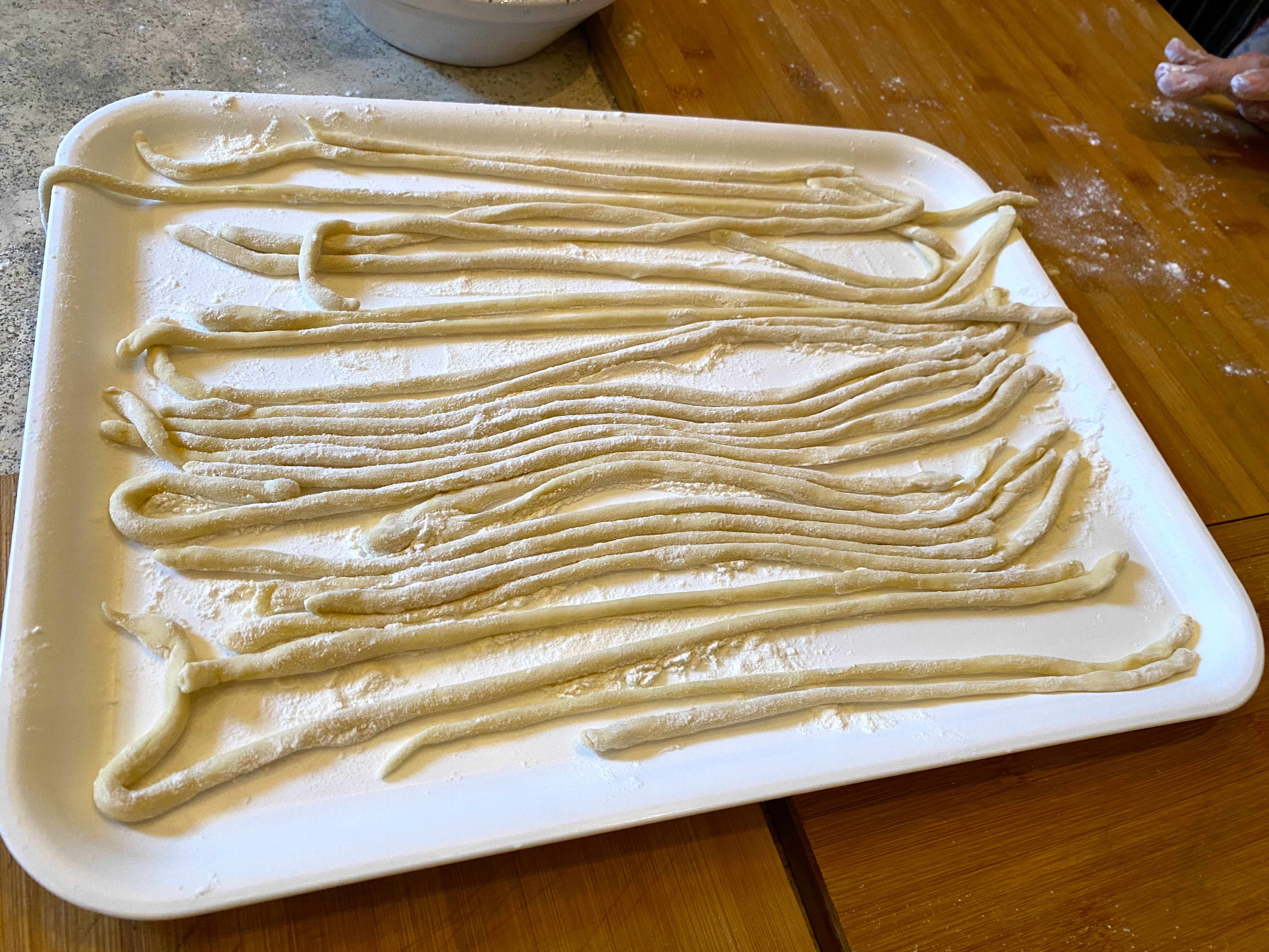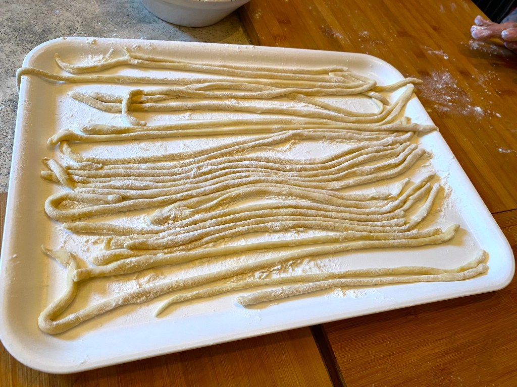We had such a great culinary adventure in Cortona – and there will be more to come…if you want to make Pici at home, just grab any dough recipe for pasta, make the big ball then roll it out and have fun!