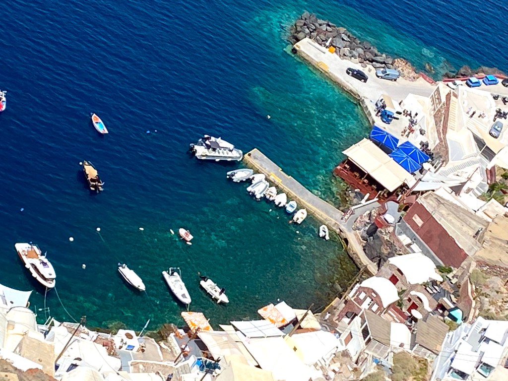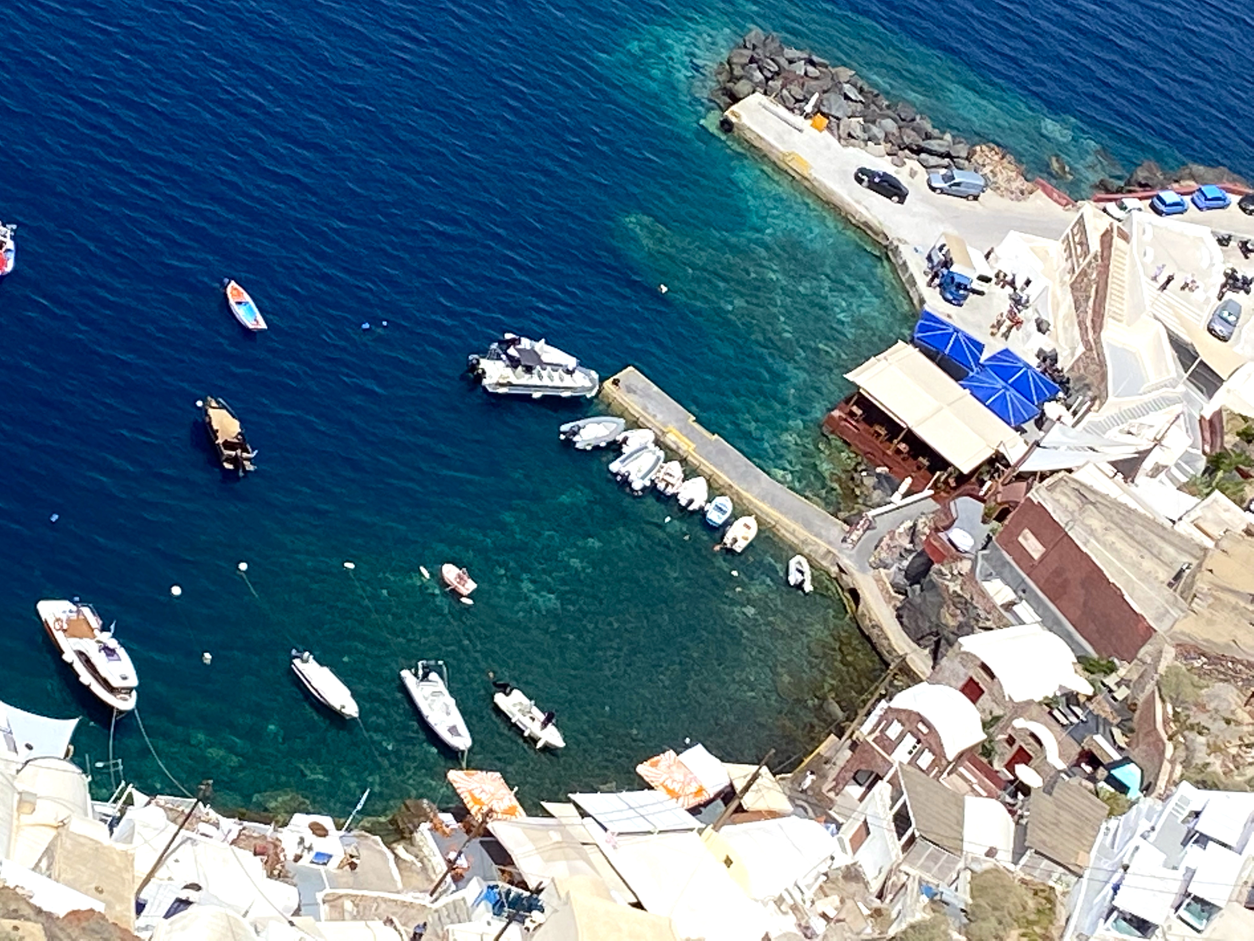 Yes, the restaurant sits WAY DOWN THERE where the boats are moored in the water! They say there are 278 steps from the top of Oia to the harbor at Ammoudi Bay, but let me show you just how big each step is – it’s actually 3-4 walking steps from one “step” to the next, so it’s really closer to 1,000 steps to the bottom!