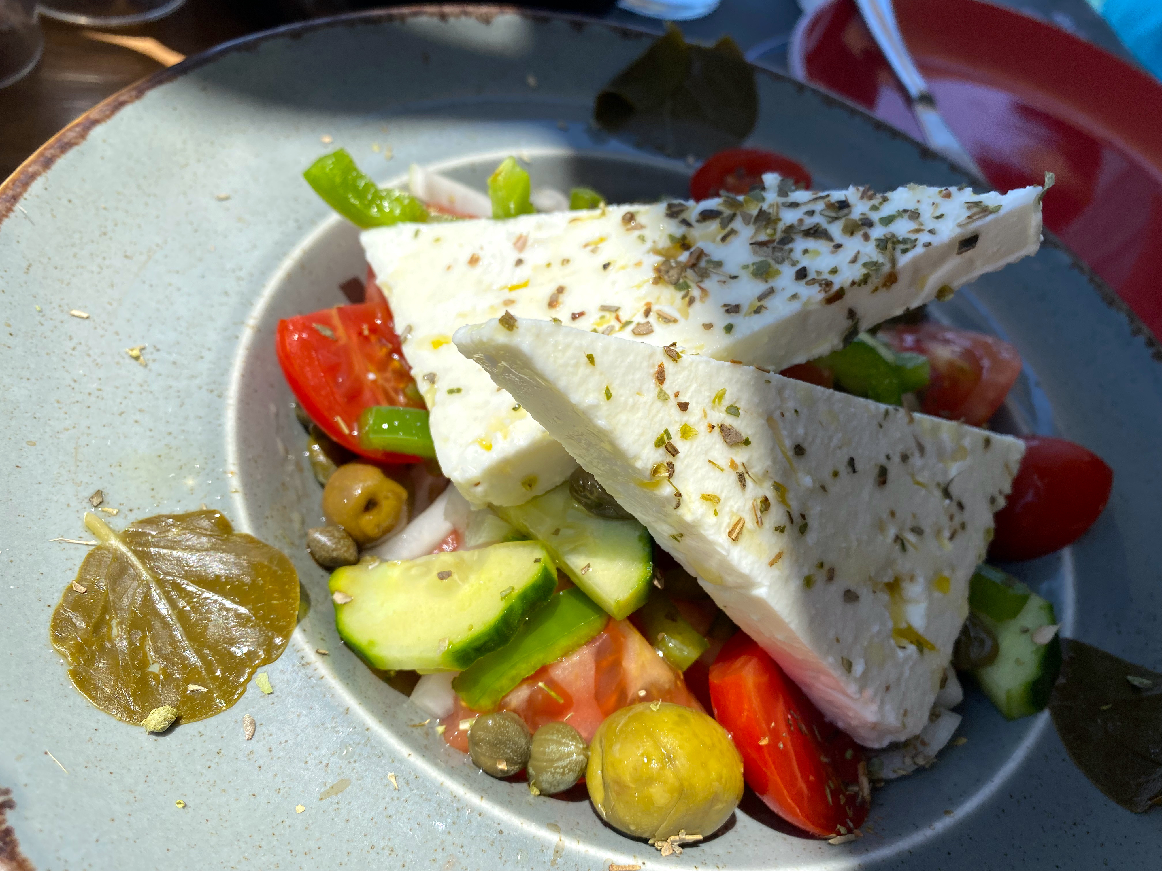 We began with their traditional Greek salad, which has tomato, cucumber, olives, onion, green peppers, feta cheese, capers, caper leaves, oregano, vinegar drops and olive oil.