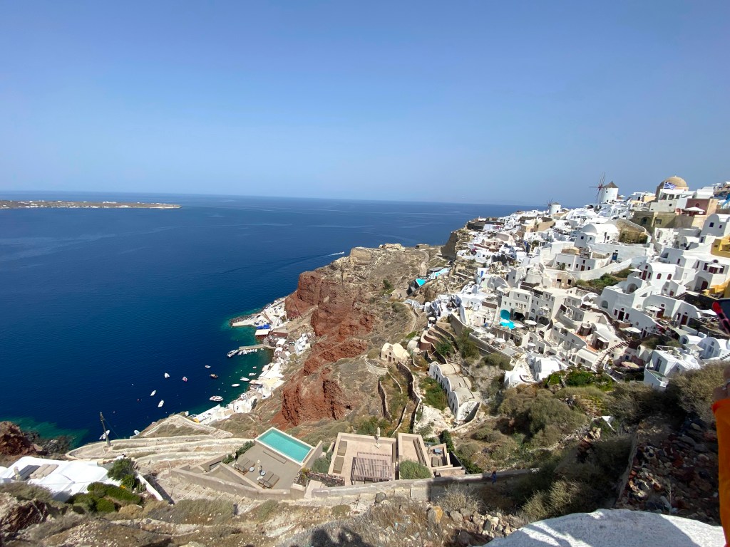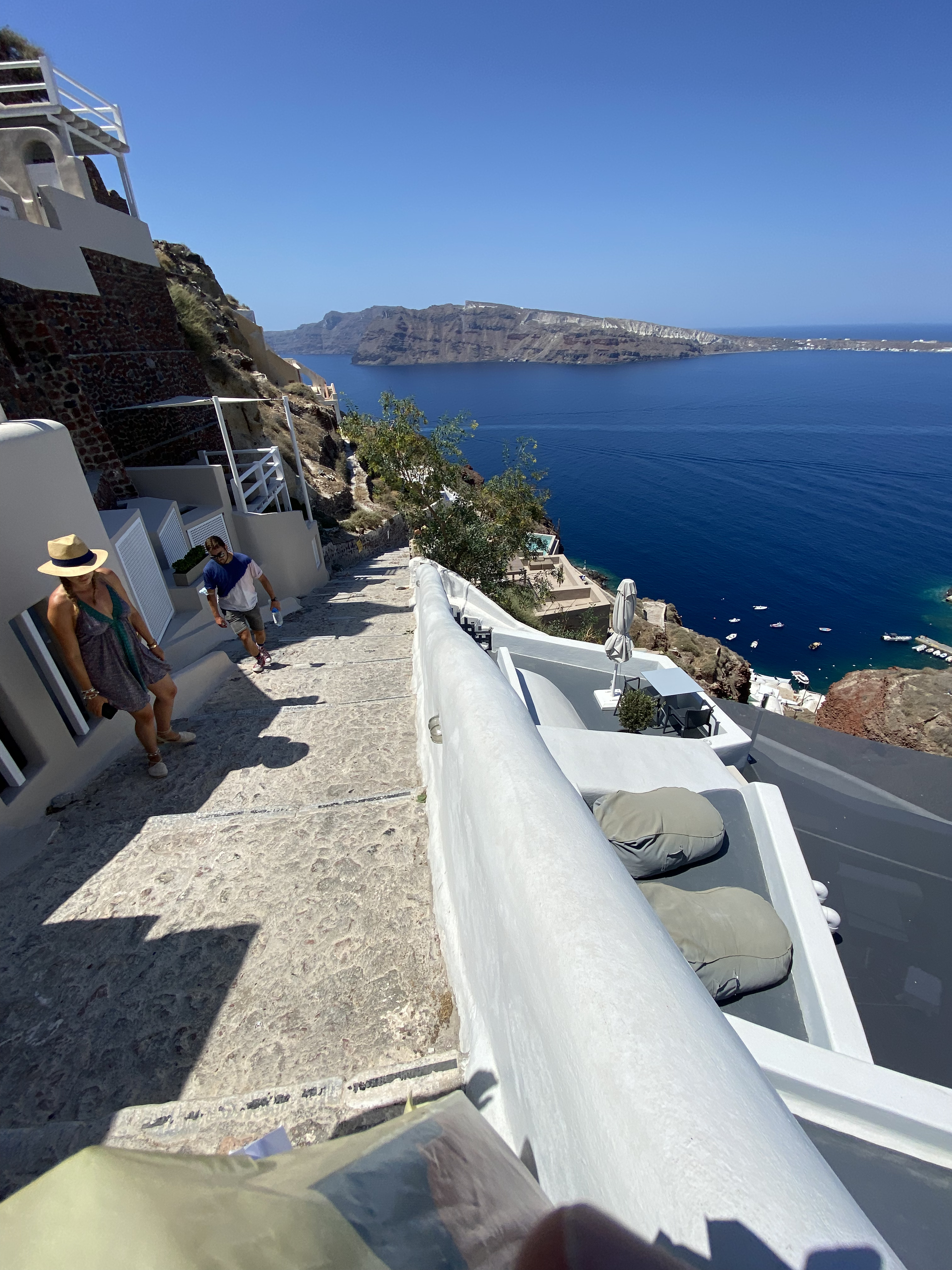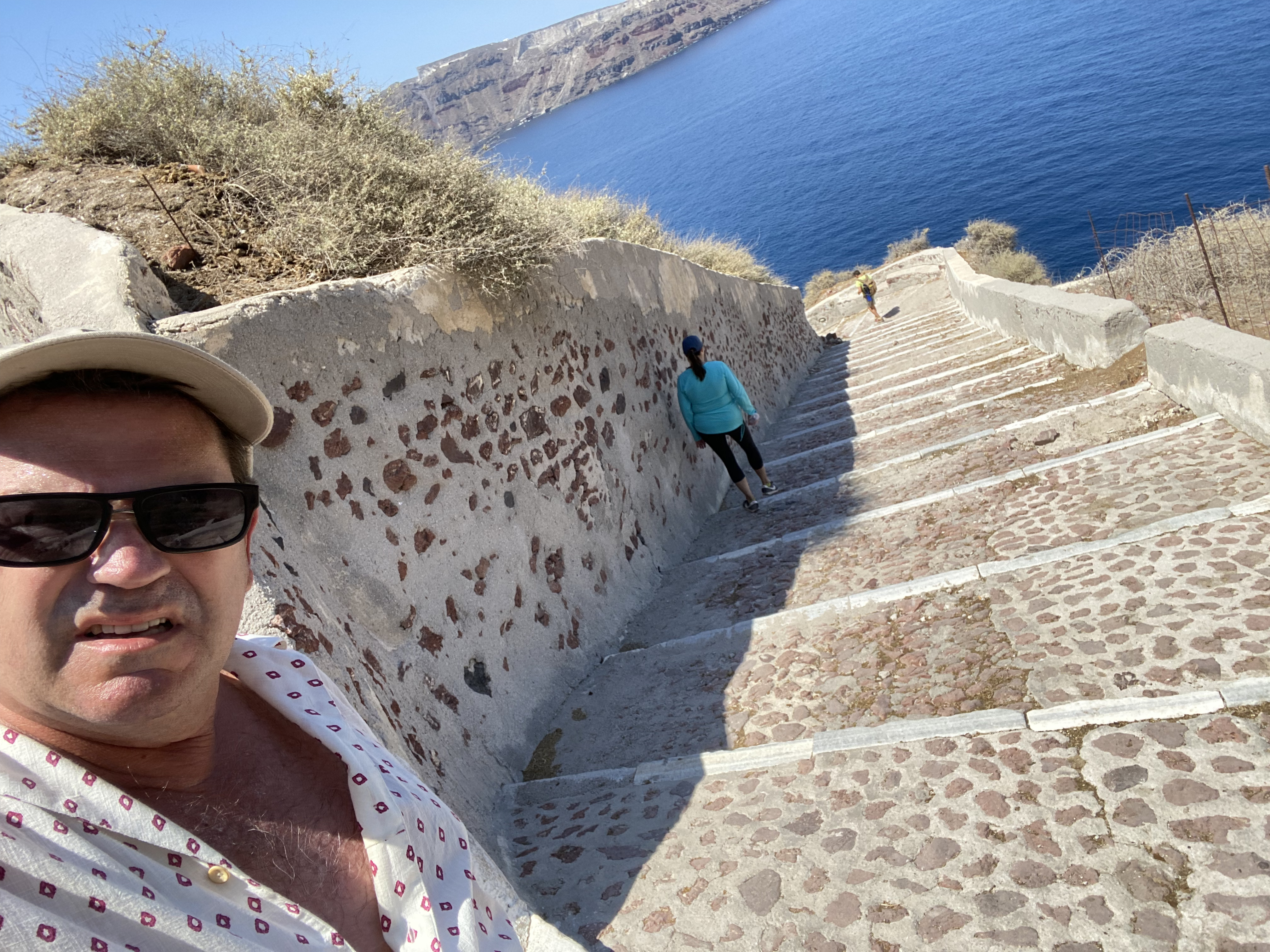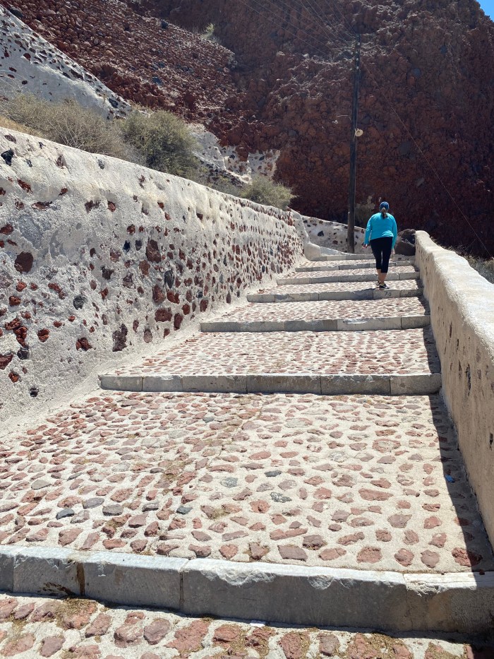 As you can see, those very long steps are also very steep – in fact, the total rise from the water to the fortress at Oia is almost 400 feet!