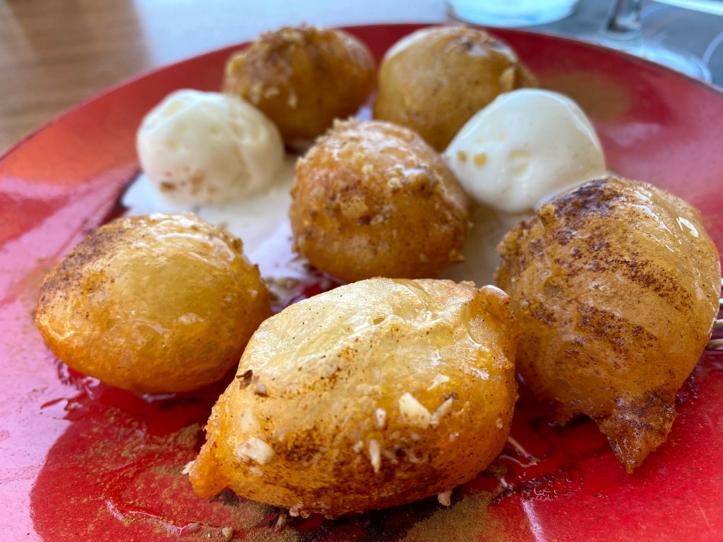 They brought us a traditional Greek dessert that is a specialty of the restaurant: their Loukoumades, fried balls of sweet dough drizzled with honey and small scoops of vanilla ice cream!