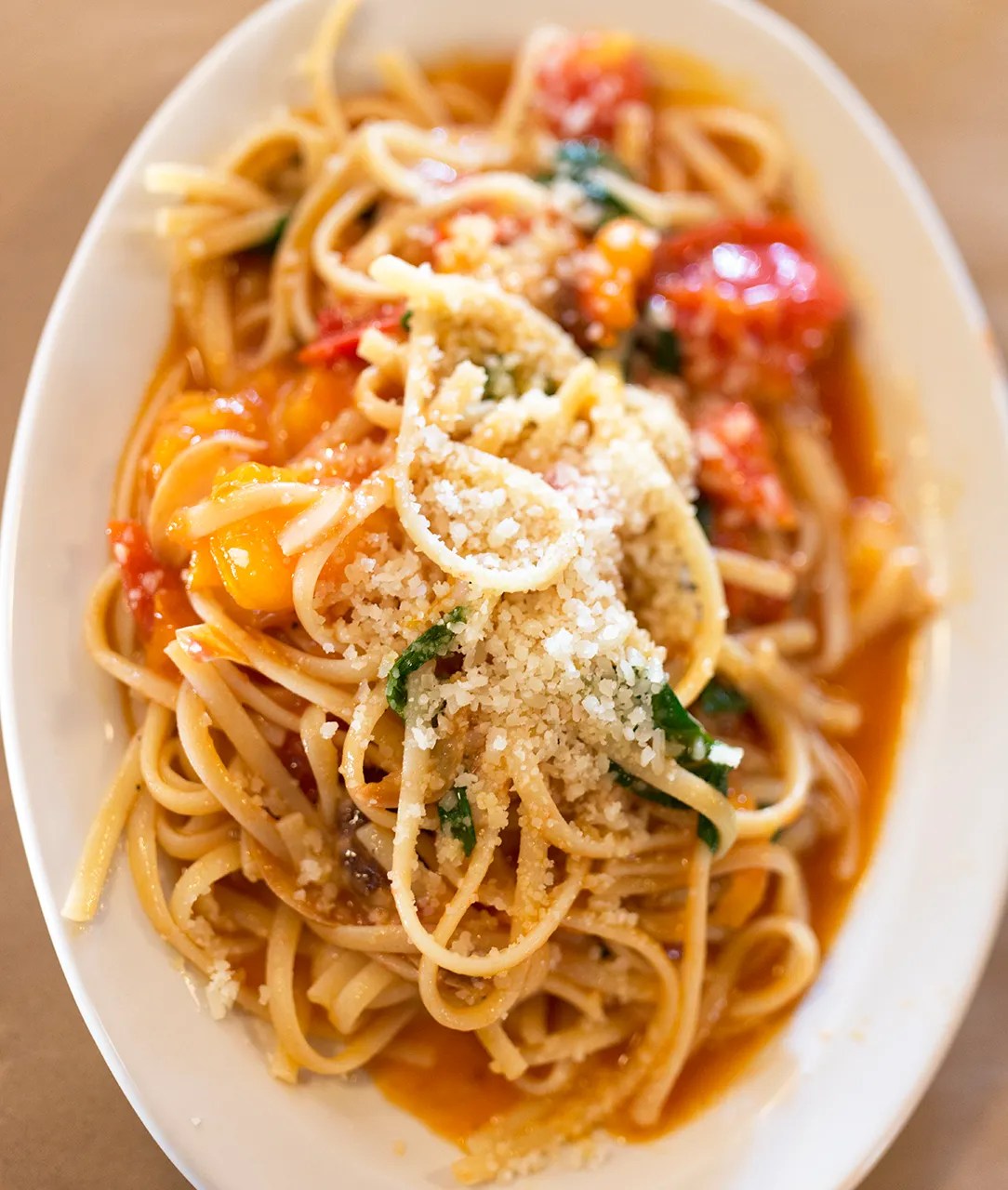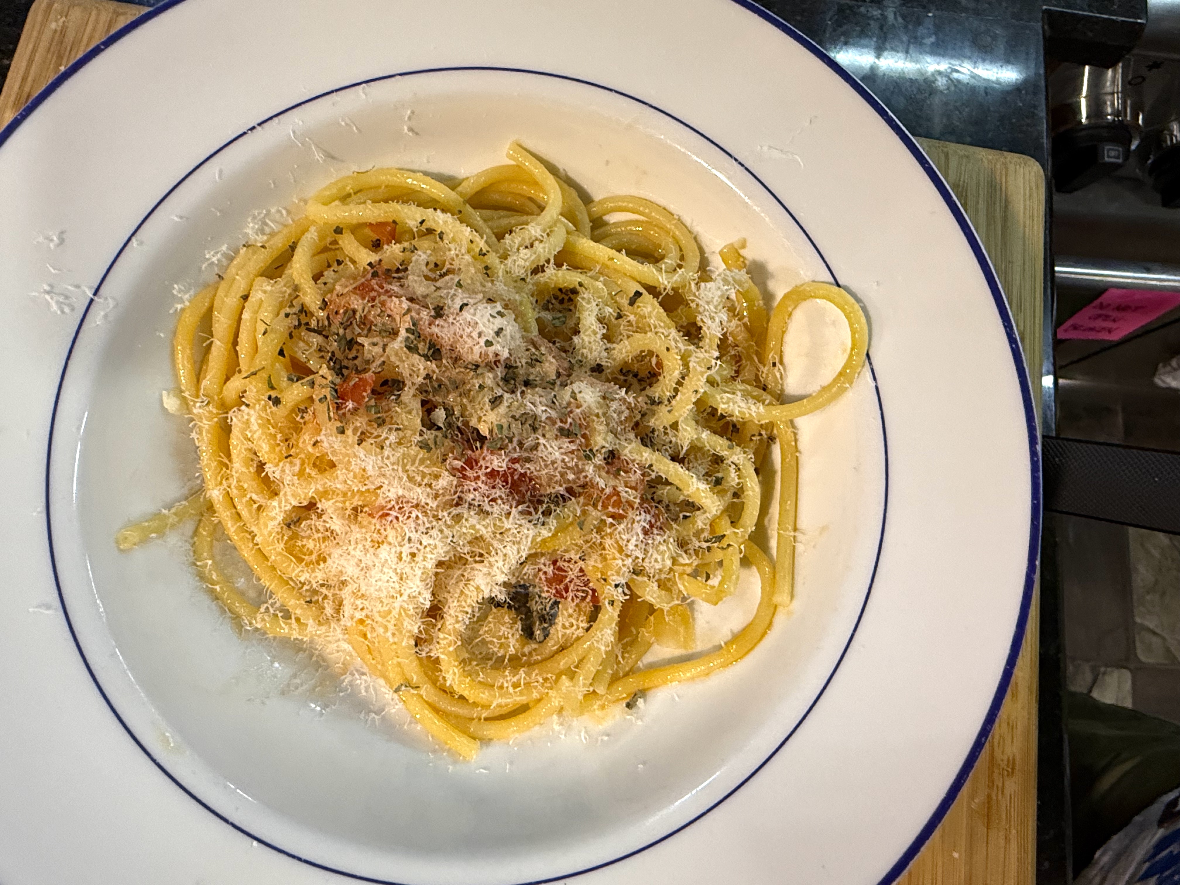 I just couldn’t help messing with this simple, delicious dish: as I said, the creaminess of the butter sauce and the freshness of the tomatoes work great together, and of course shaved Parmesan on anything makes it pop….perfection.