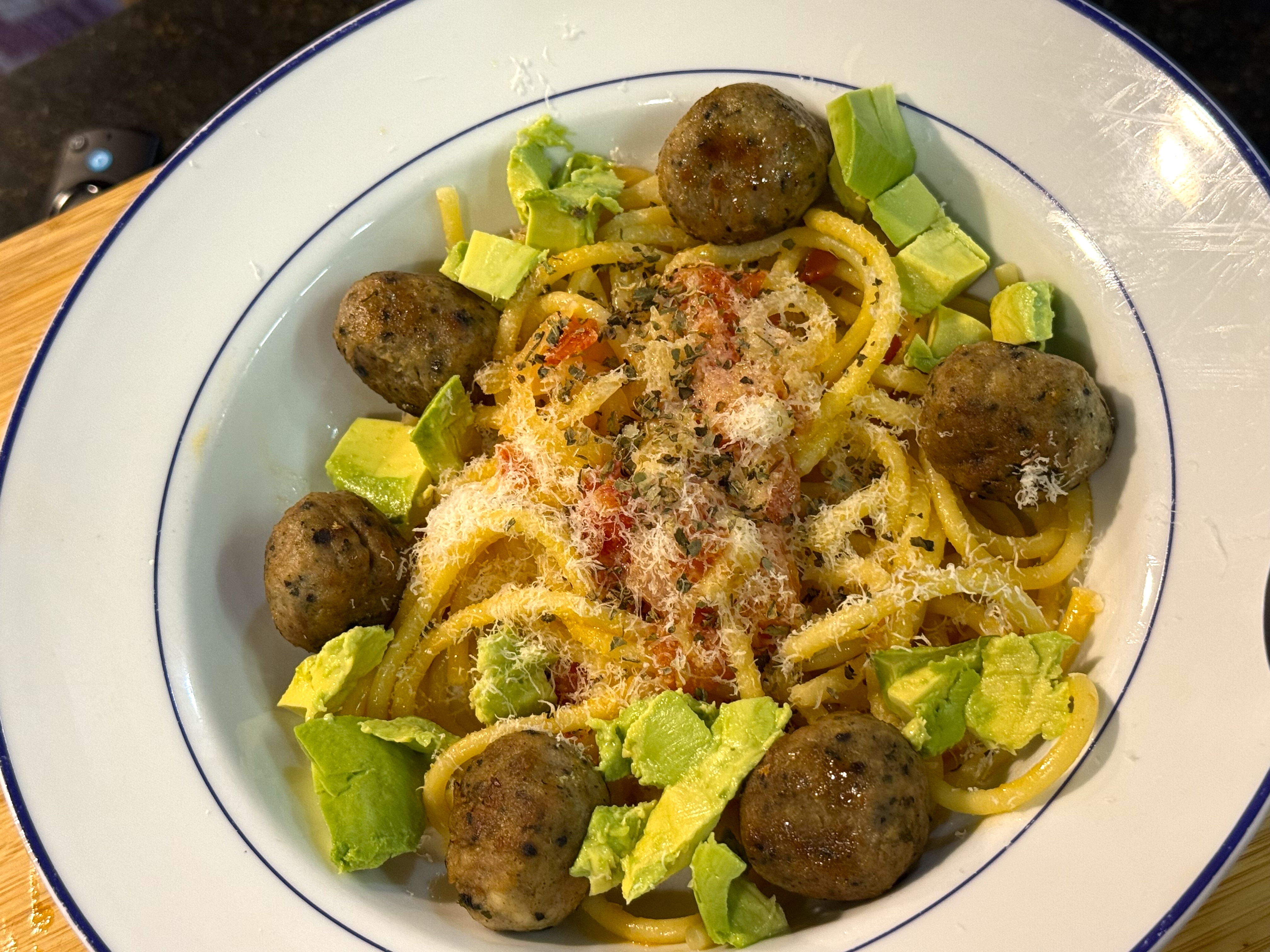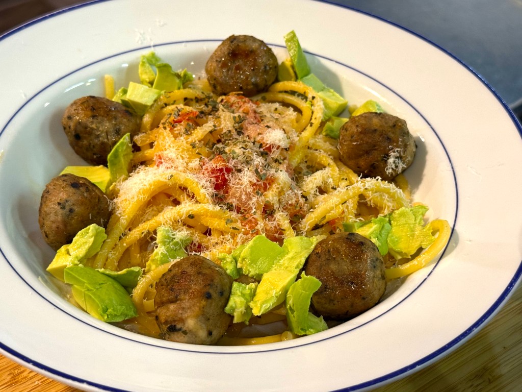I’m on board for that buttery pasta and meatballs, but hold the avocado! 😊