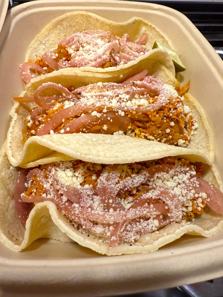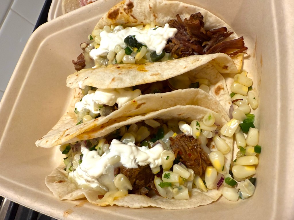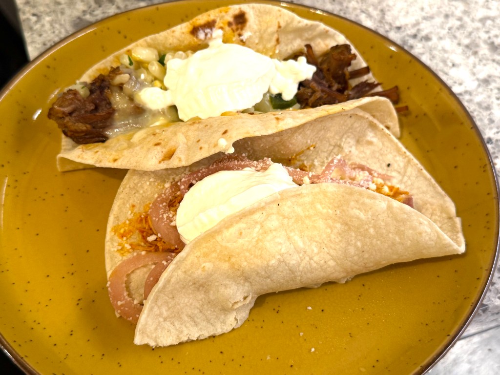 First, I had slowly simmered chicken topped with red onion and a dusting of Mexican cheese, followed by soft tacos stuffed with barbicoa beef, slowly simmered in spices, then topped with sour cream and roast corn….delicious and delicate – which isn’t always the case!