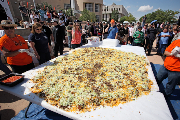In this Saturday Sept. 10, 2011 photo released by the New Mexico Tourism Department, residents help build what state officials are calling the “world’s largest Navajo taco,” in Gallup, N.M. Organizers say no world record exists for the largest Navajo taco so they built one using 150 pieces of fry bread and 30 pounds of green chile. According to volunteers and state officials, the Navajo taco created Saturday was more than 10 feet in diameter and also needed 65 pounds of ground beef, 65 pounds of beans, 50 pounds of lettuce and 90 pounds of cheese. (AP Photo/New Mexico Tourism Department)