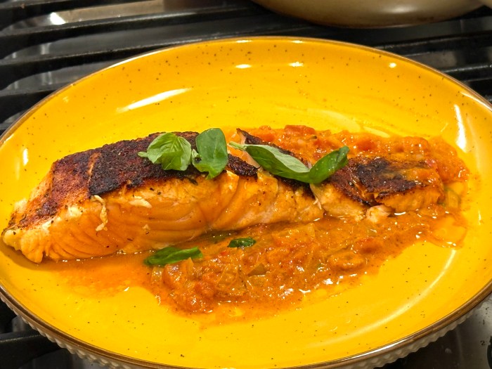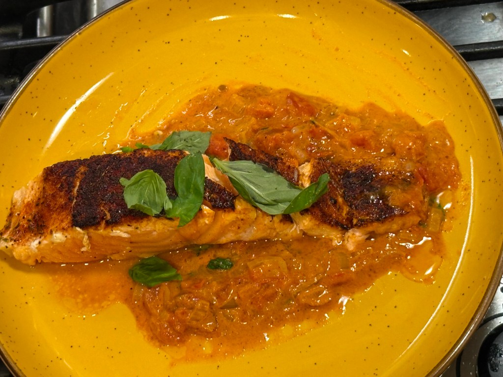 Now onto the beautiful salmon – and if you follow gymnastics, they have a phrase “didn’t stick the landing”: it’s when the athlete doesn’t land solidly and moves a foot…it is a costly mistake in gymnasics and as you will see, in my cooking too!