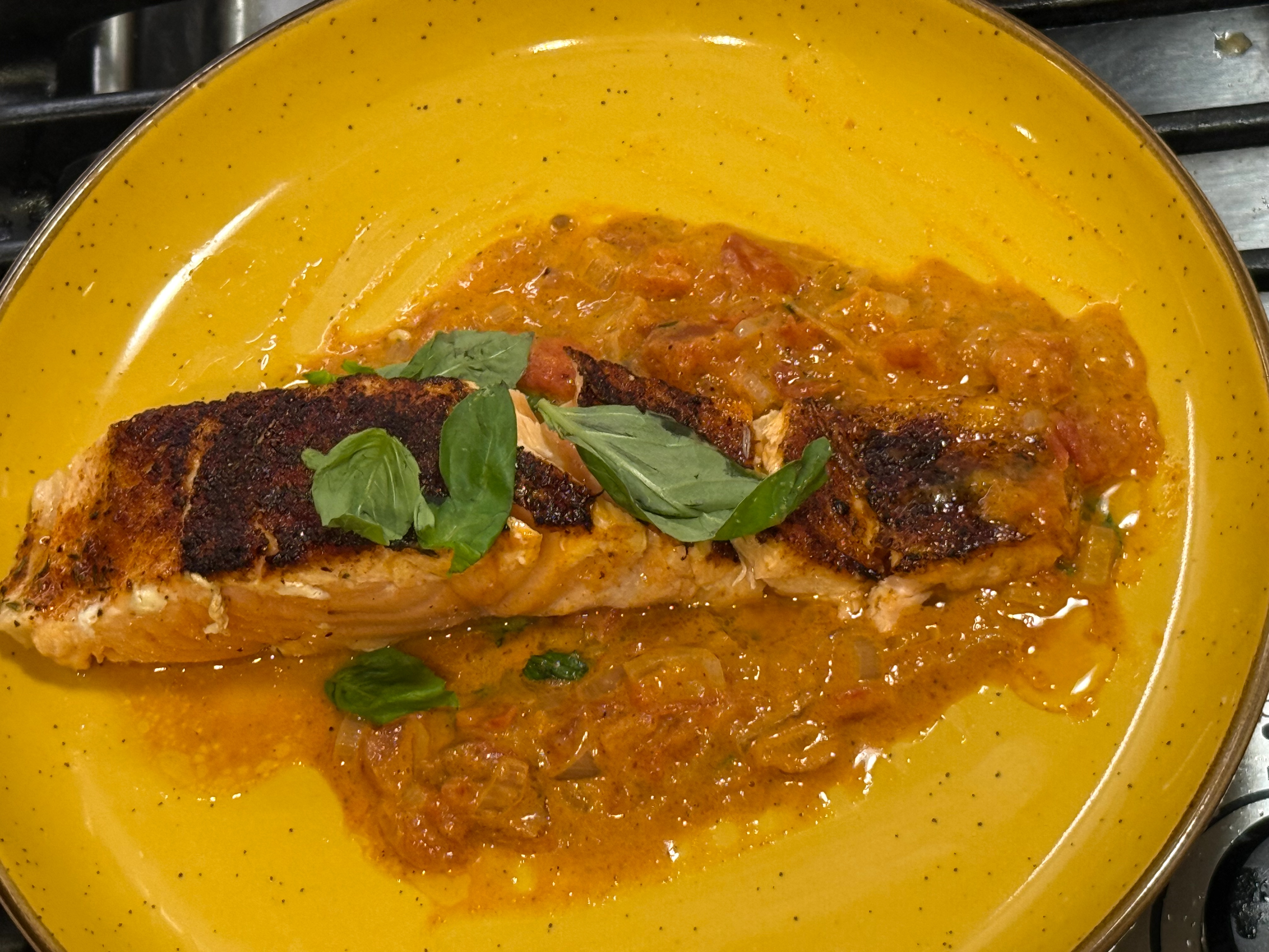 To serve, stir the basil into the sauce. Spoon several tablespoons of sauce in the middle of the plate and place the salmon on top of the sauce. A crack of pepper and serve with crusty bread.