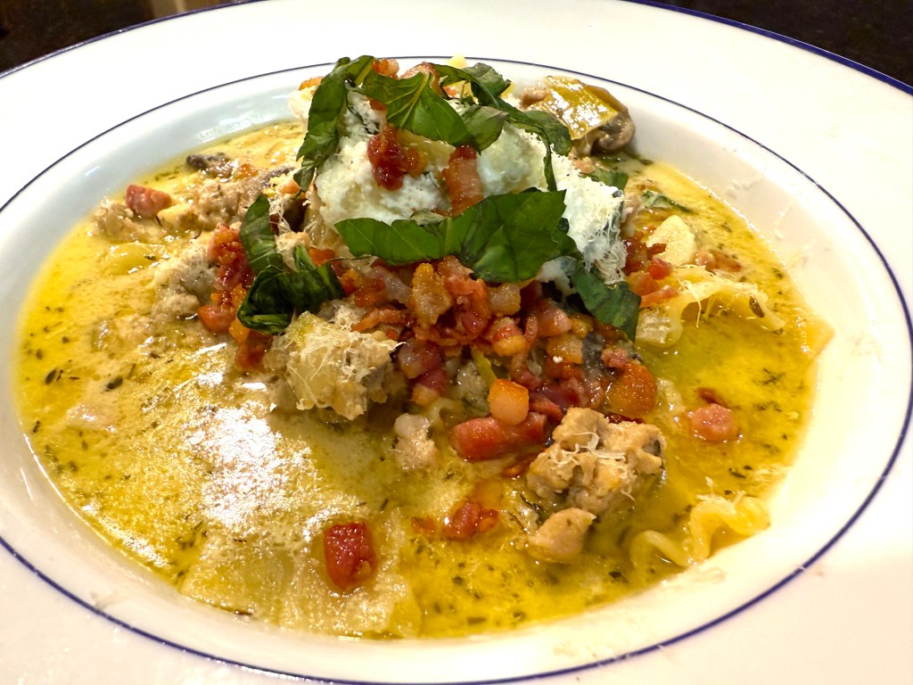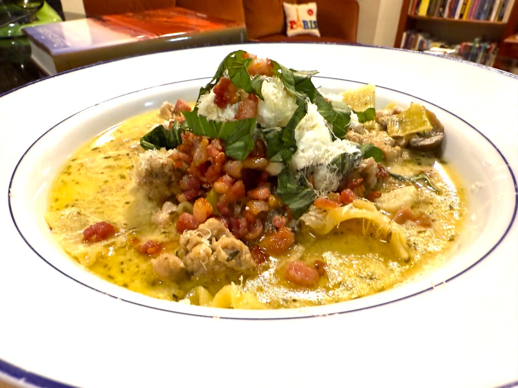 It plates well, that’s for sure! My review? It was delicious, the pancetta gave it a salty umami beat, I would use regular sausage instead of chicken for a better flavor, and the balance of ingredients worked well – with the lemony Ricotta topping a nice way to add some cool goodness to the hot soup…and an important note: I have been harping on how healthy “wet” food is: