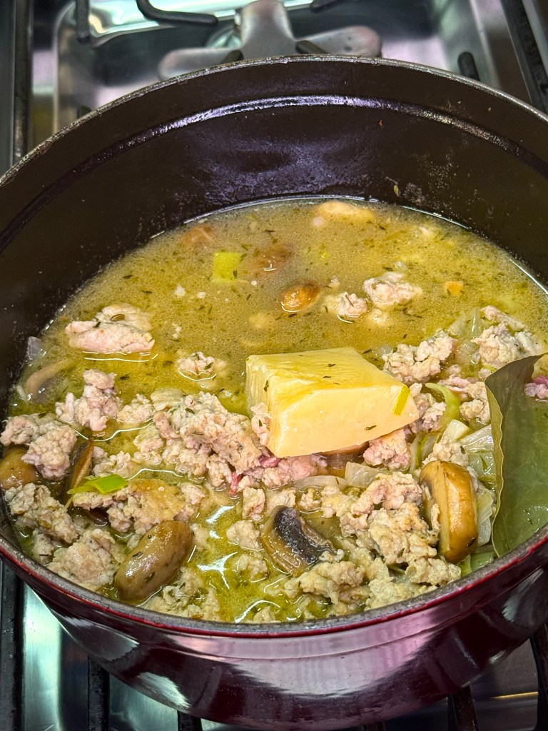 Stir in the chicken broth, cooked sausage, bay leaf, and thyme – then my favorite: the parmesan rind!