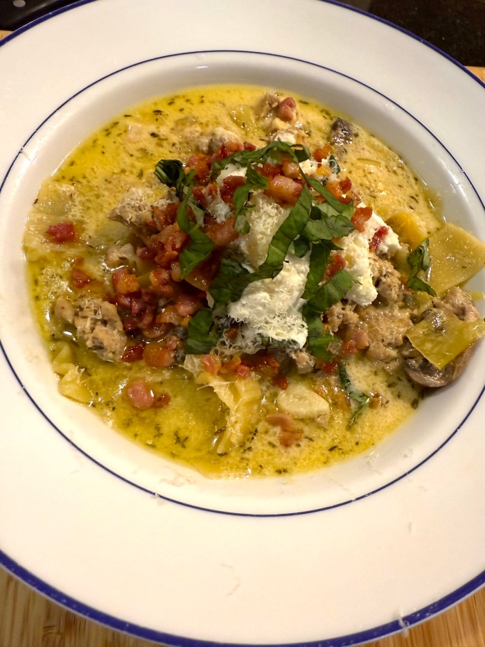 First of all, if you like a creamy soup with a strong parmesan flavor, this is the one! The noodles are fun, but you will need to enjoy a heavy noodle like this one – however, you can always break it up into smaller pieces as well!