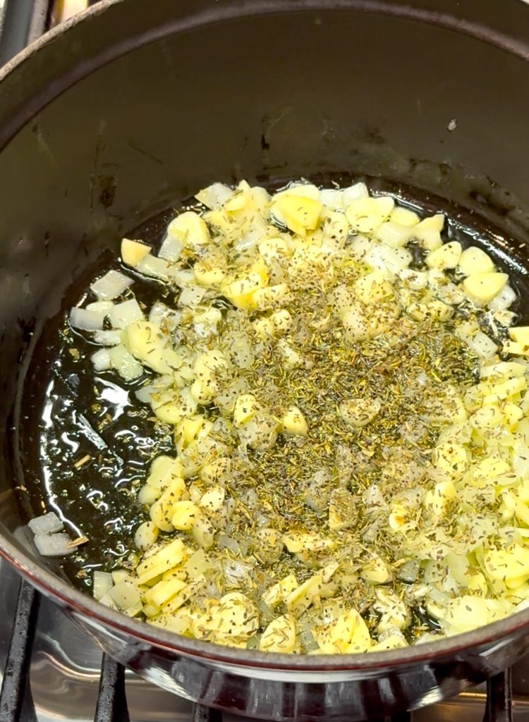Push the mushrooms to one side of the pot, then add the onion and leek with apinch of salt and pepper. Cook 4–5 minutes, stirring occasionally.