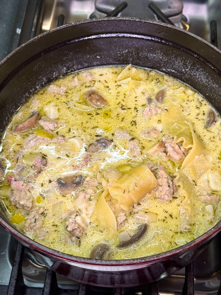 First, stir in the heavy cream, then add the broken lasagna noodles. Partially cover and simmer until al dente, 12–15 minutes, stirring often so they don’t stick together. Here’s how it looked: