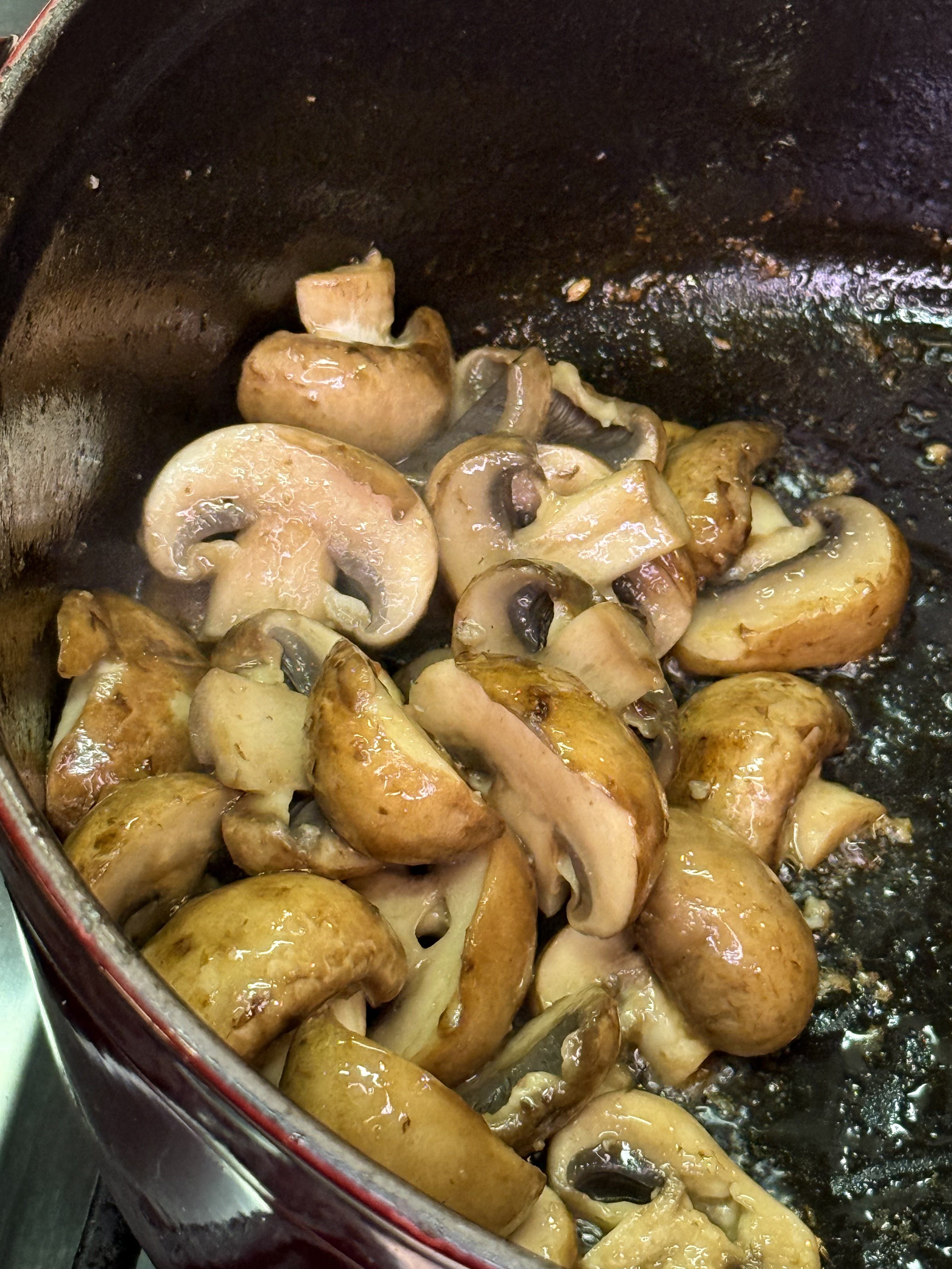 I removed the mushrooms to make a bit more room. Add the garlic, oregano, and thyme, and cook for 1 minute more, then pour in the wine, scrape up any brown bits, and simmer for 2 minutes. Return the mushrooms to the pan.