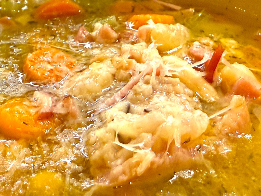 The best part is always when you shave more parmesan over the soup and set it down on the table!
