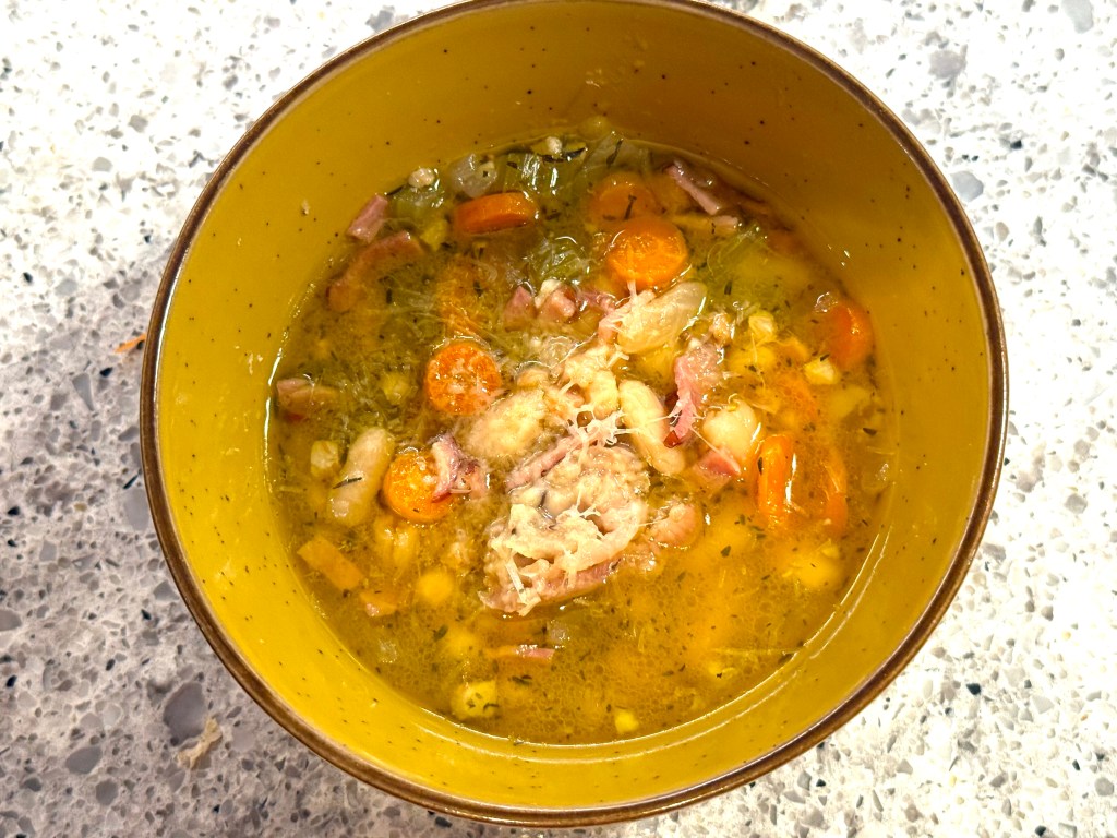 It’s a nutricious and healthy dish – I mean, there is very little actual ham meat in the soup: it’s mostly white beans and vegetables, and the pancetta is so finely diced it’s also not much meat…I loved it and more importantly, so did Alex!