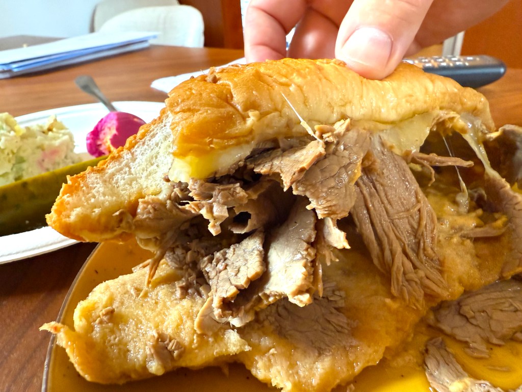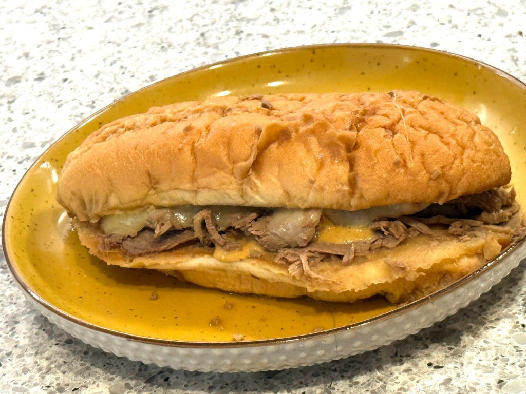 The hot beef melts the cheese nicely, and the au jus makes the sandwich a soggy treat! Here’s my taste test: