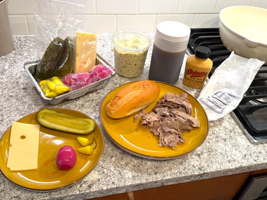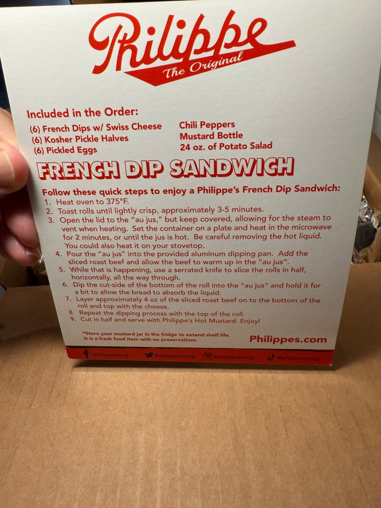 Philippe The Original French Dip ships its famous French Dip nationwide on Goldbelly! The French Dip Party Pack includes six of Philippe’s trademark French Dip sandwiches, 1.5 pounds of homemade potato salad, a container of pickles, and a bottle of their legendary spicy mustard! Here’s a look at what arrived:
