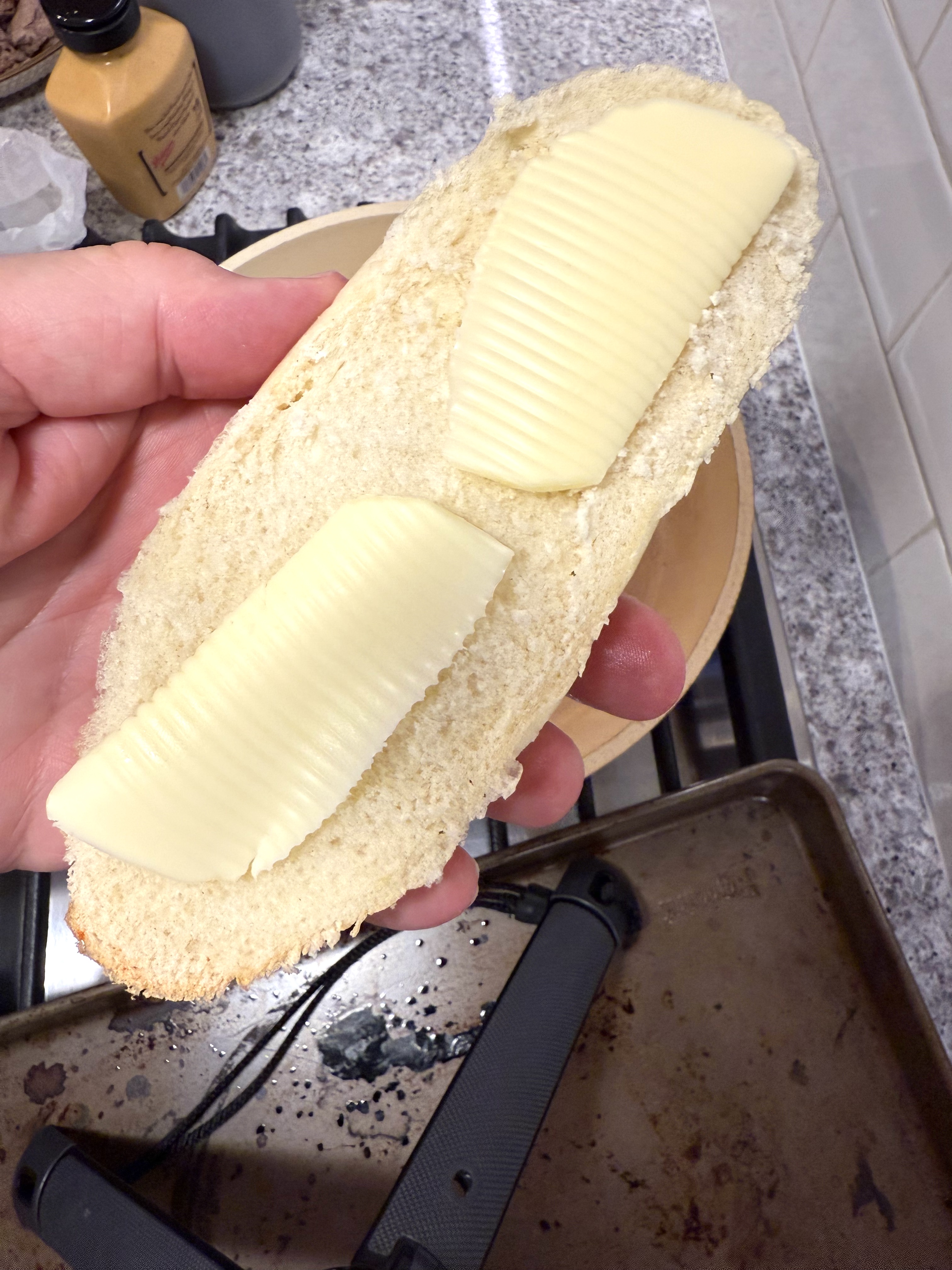 Add some butter to the French dip bun and toast it: