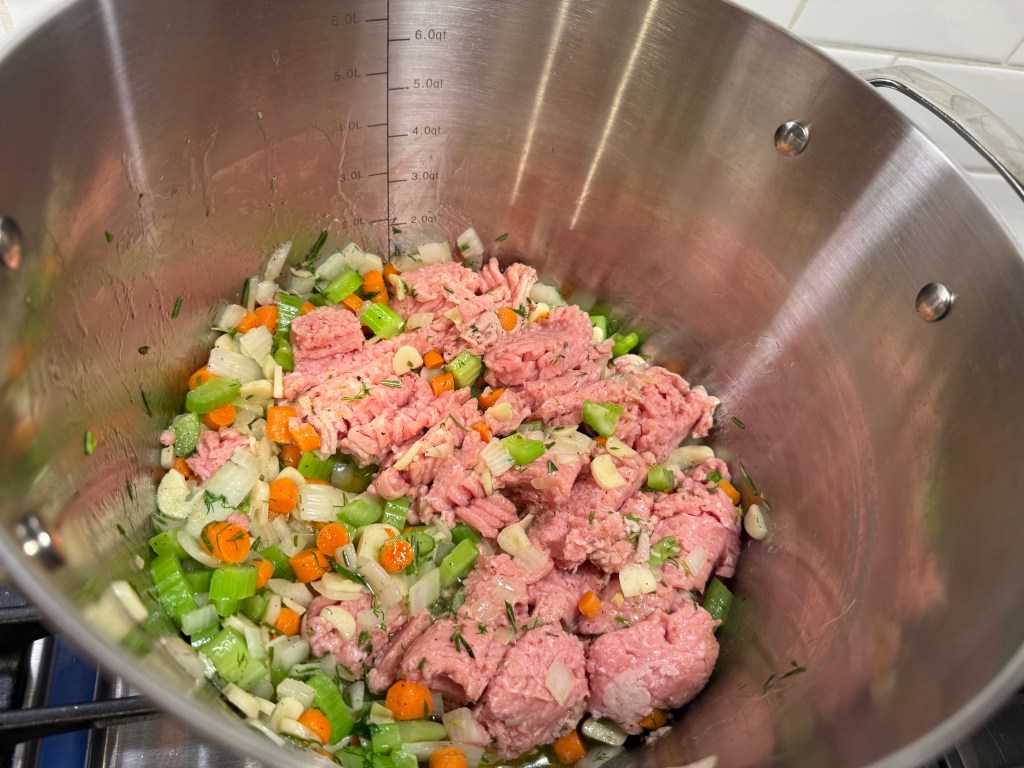 You begin by sautéing the onion, carrot, celery, garlic, and fresh rosemary in with your ground turkey – it makes for an incredibly flavorful soup base.