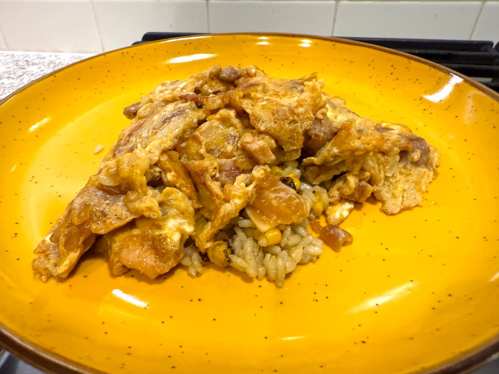 So, the rice is done, the slurry ready to go, and the pork cooked…so now I mixed the eggs, added the water chestnuts and slurry, then added the marinated cooked pork/chicken mixture and fried it up in a pan…