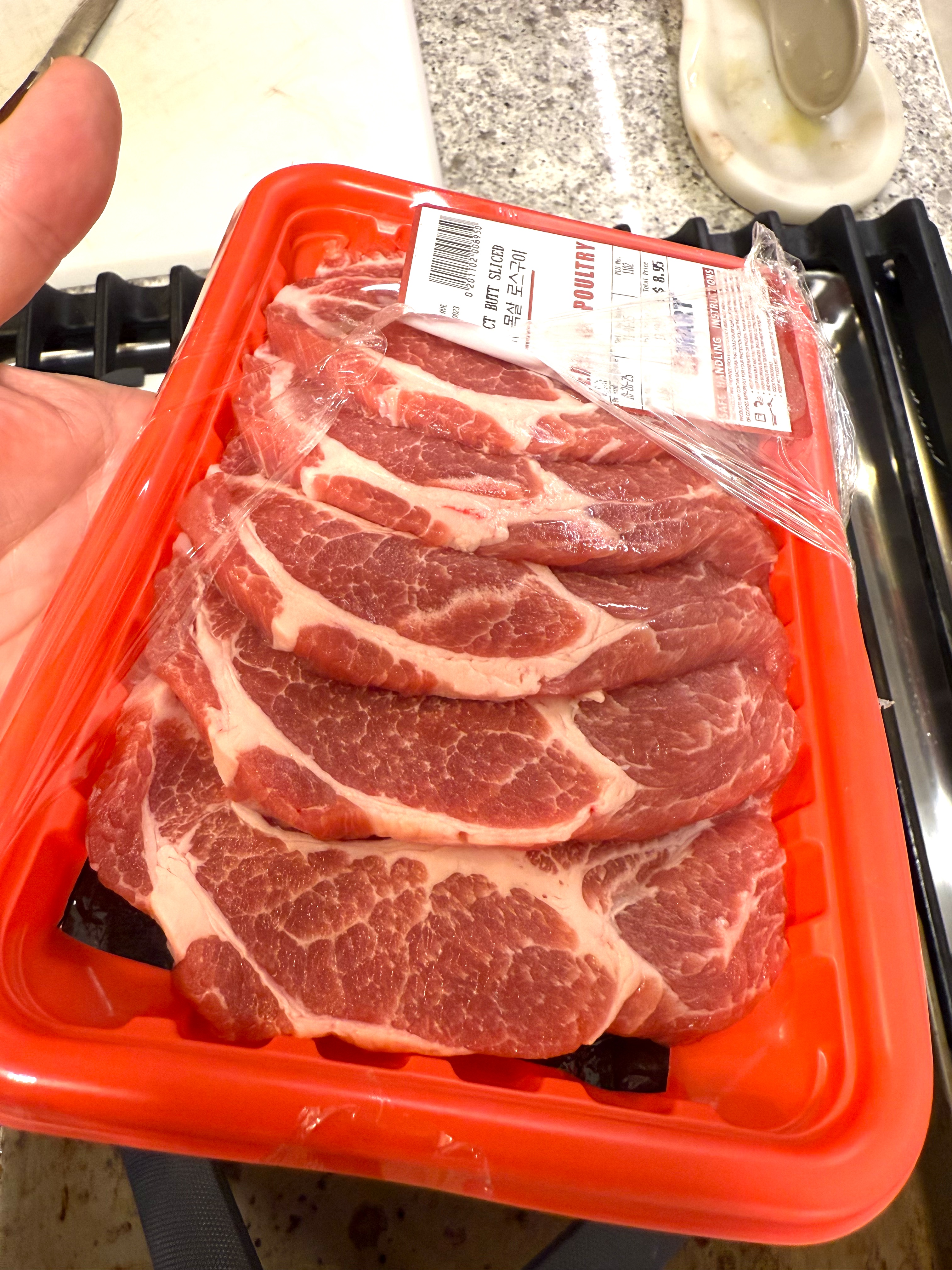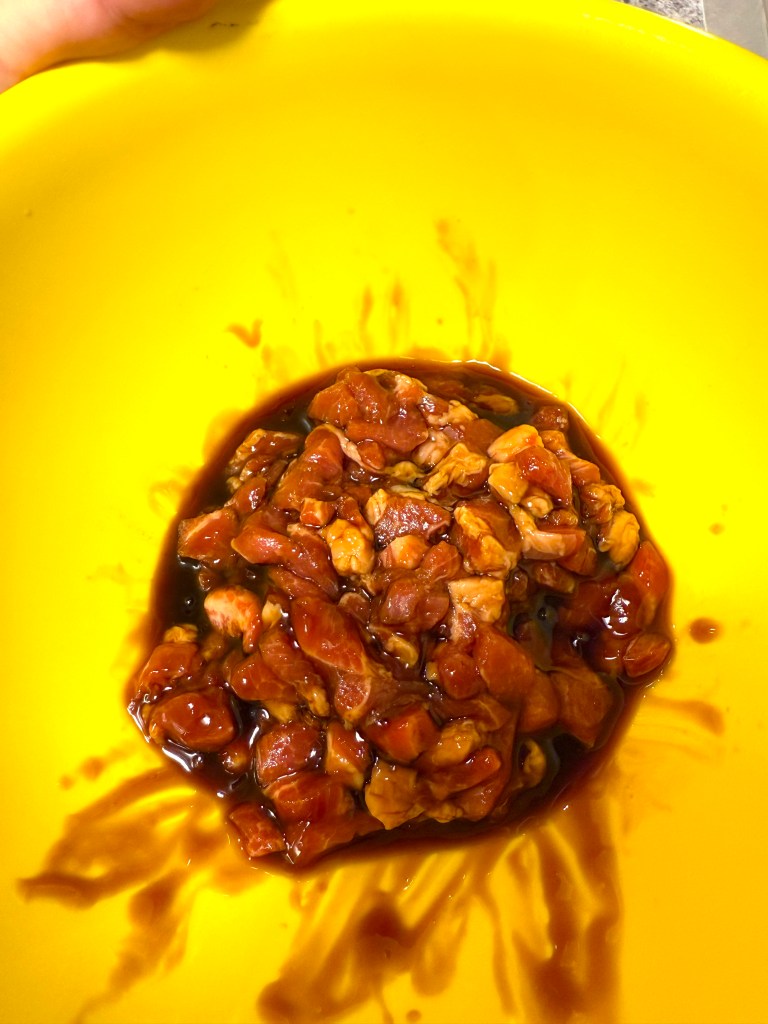 I took sliced pork and diced it up, then combined the pork with 1 tbl oyster sauce and 1 tbl soy sauce and set aside to marinate: