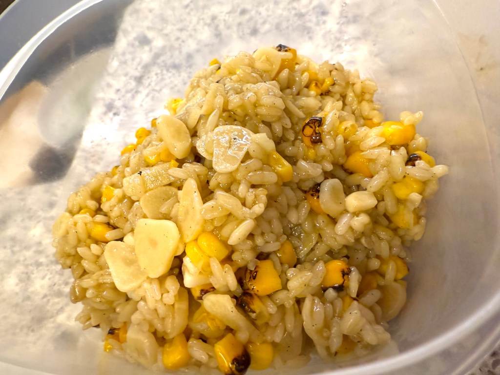 I make my rice with chicken stock, and I add sautéed garlic and some roasted corn – a bit more of a pop when you eat it: