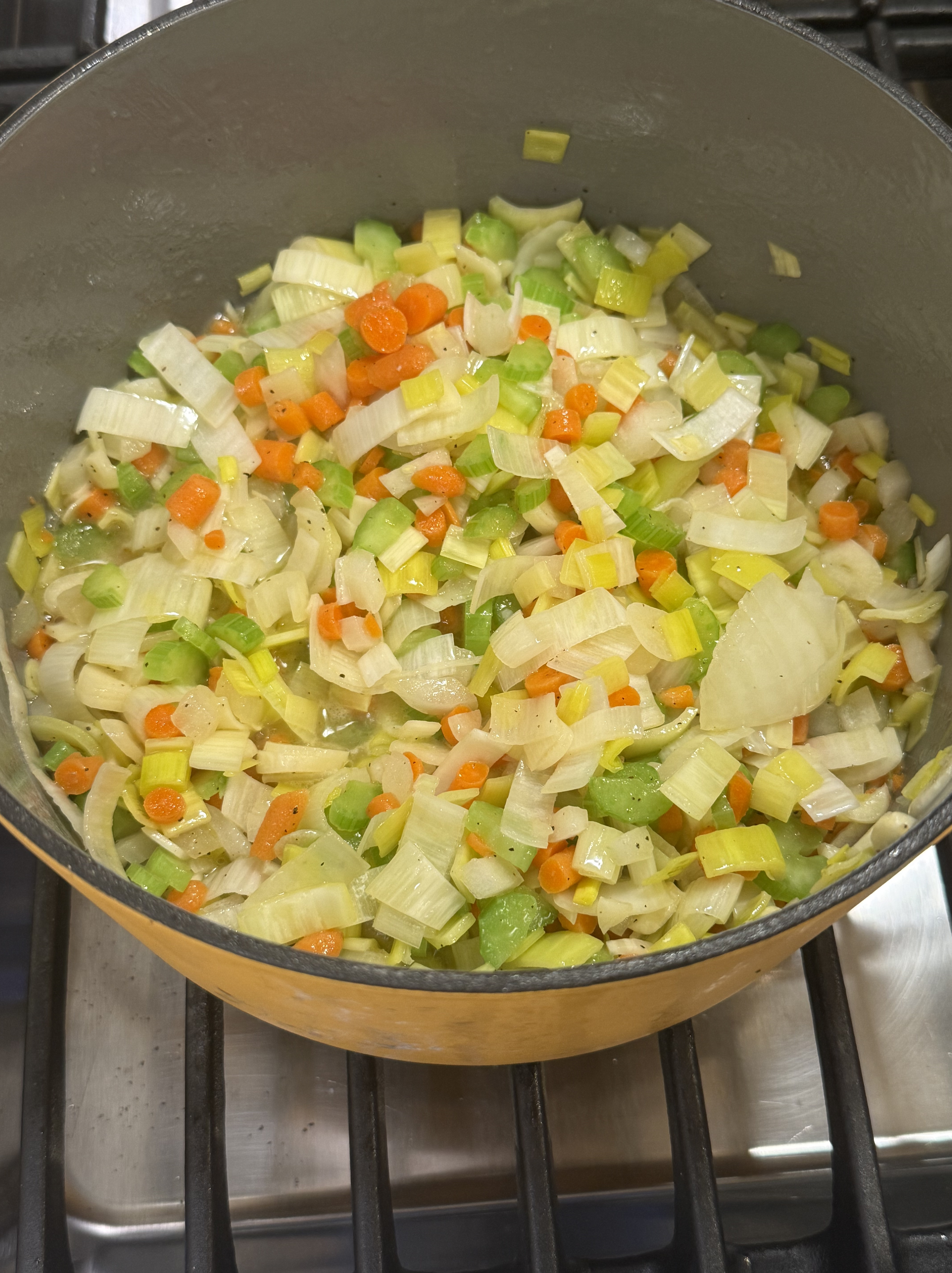 Add the olive oil to a large pot or Dutch oven on medium heat. Add the onion, celery, leeks and carrots, and season with salt and pepper. Cook for 7-8 minutes until veggies have softened, stirring occasionally.