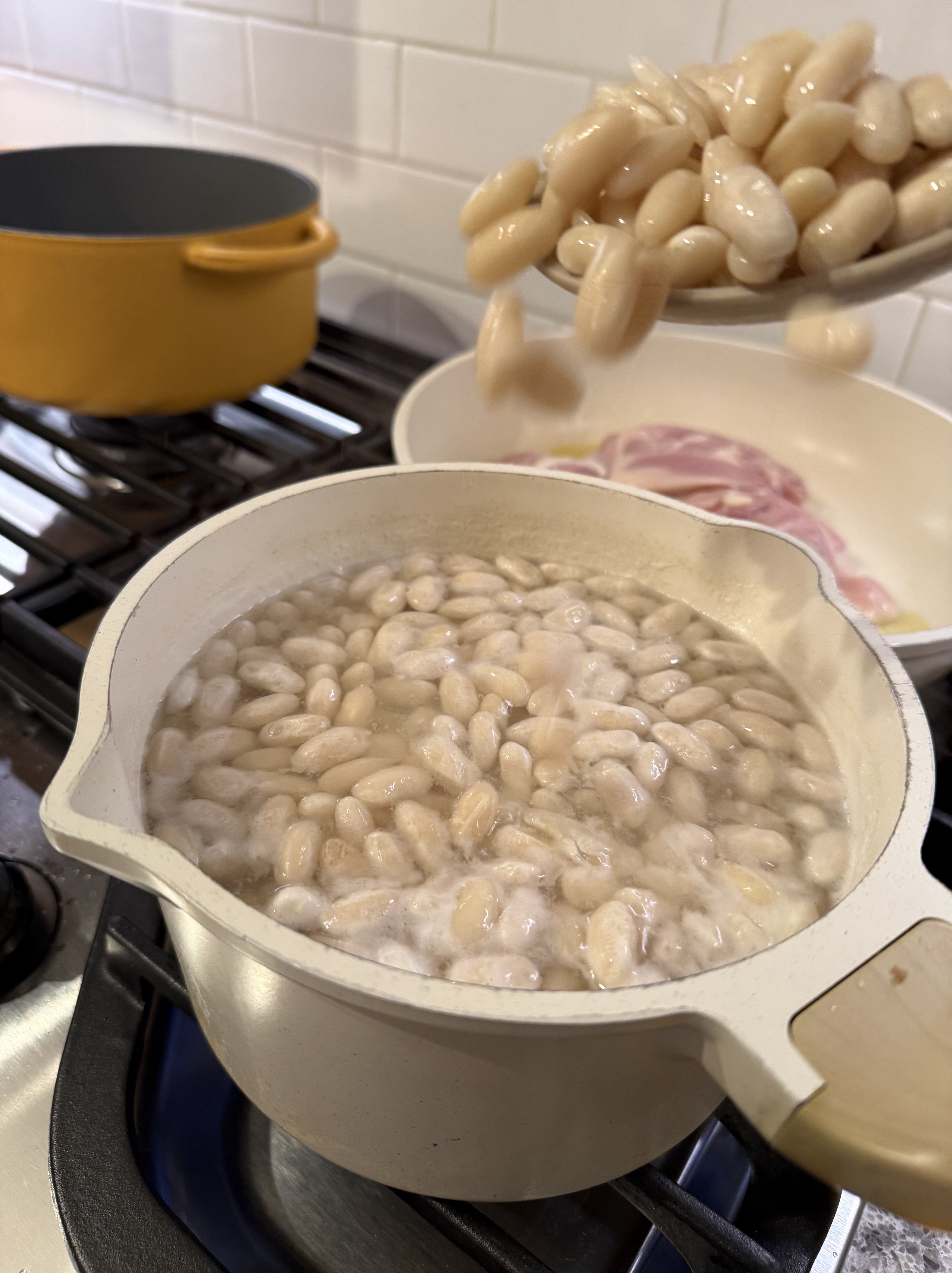Yes, the egg and lemon mixture is a revelation! Let’s get cooking: first, I prepped the beans by washing them and then bringing to a boil and simmer: