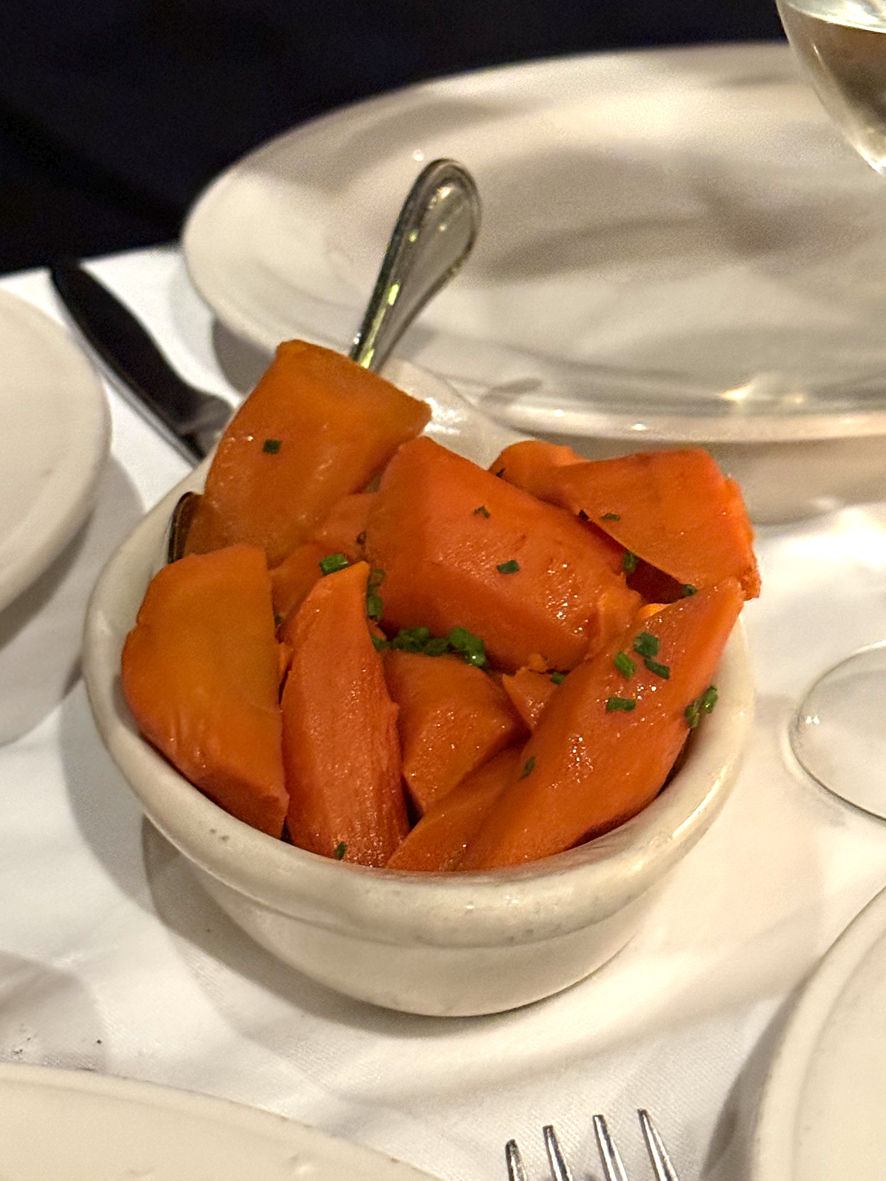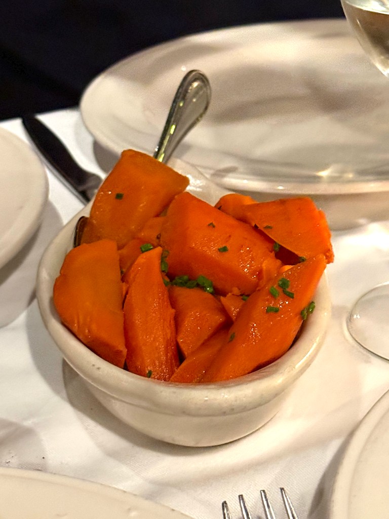 The Brown Butter Carrots are nicely sized chunks with a light glaze, and the creamed spinach is delicious – the flavor of the spinach really stands out, not masked by cream, which is subtle…and of course, any good steakhouse has potato diesels, and we really love this “has brown”: a crispy exterior and creamy interior!