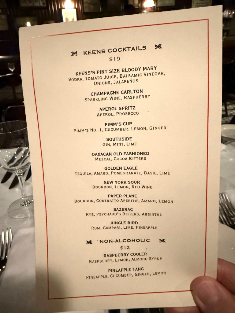 Keens is a longtime classic in New York for a reason: an incredibly professional staff, delicious and inventive drinks, and food that looks beautiful when it arrives from the kitchen, and tastes great!