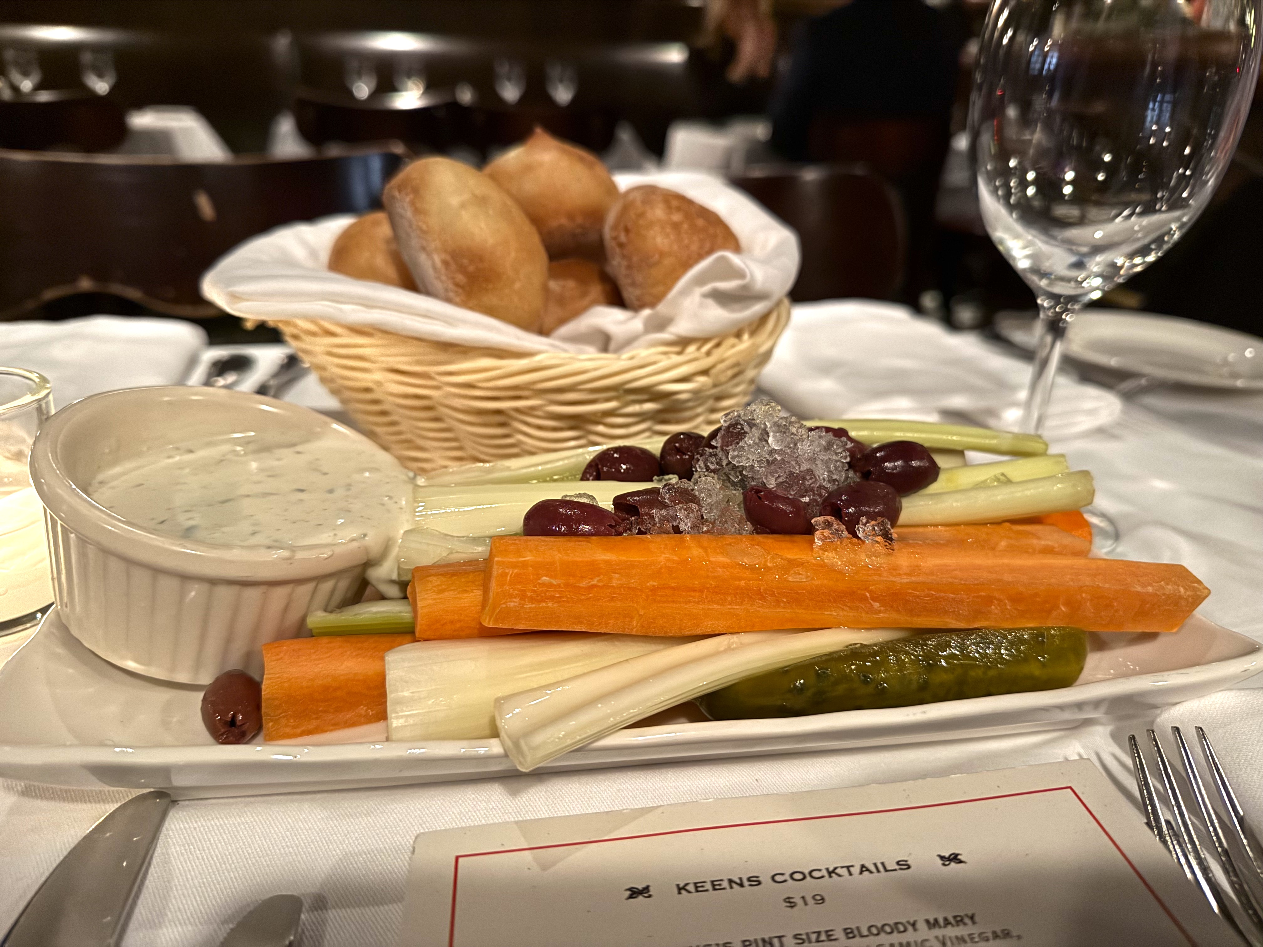 Your server sets down an icy plate filled with carrots, pickles and celery, along with Kalamata olives and bleu cheese dip – and a basket of rolls and butter as well – all free!