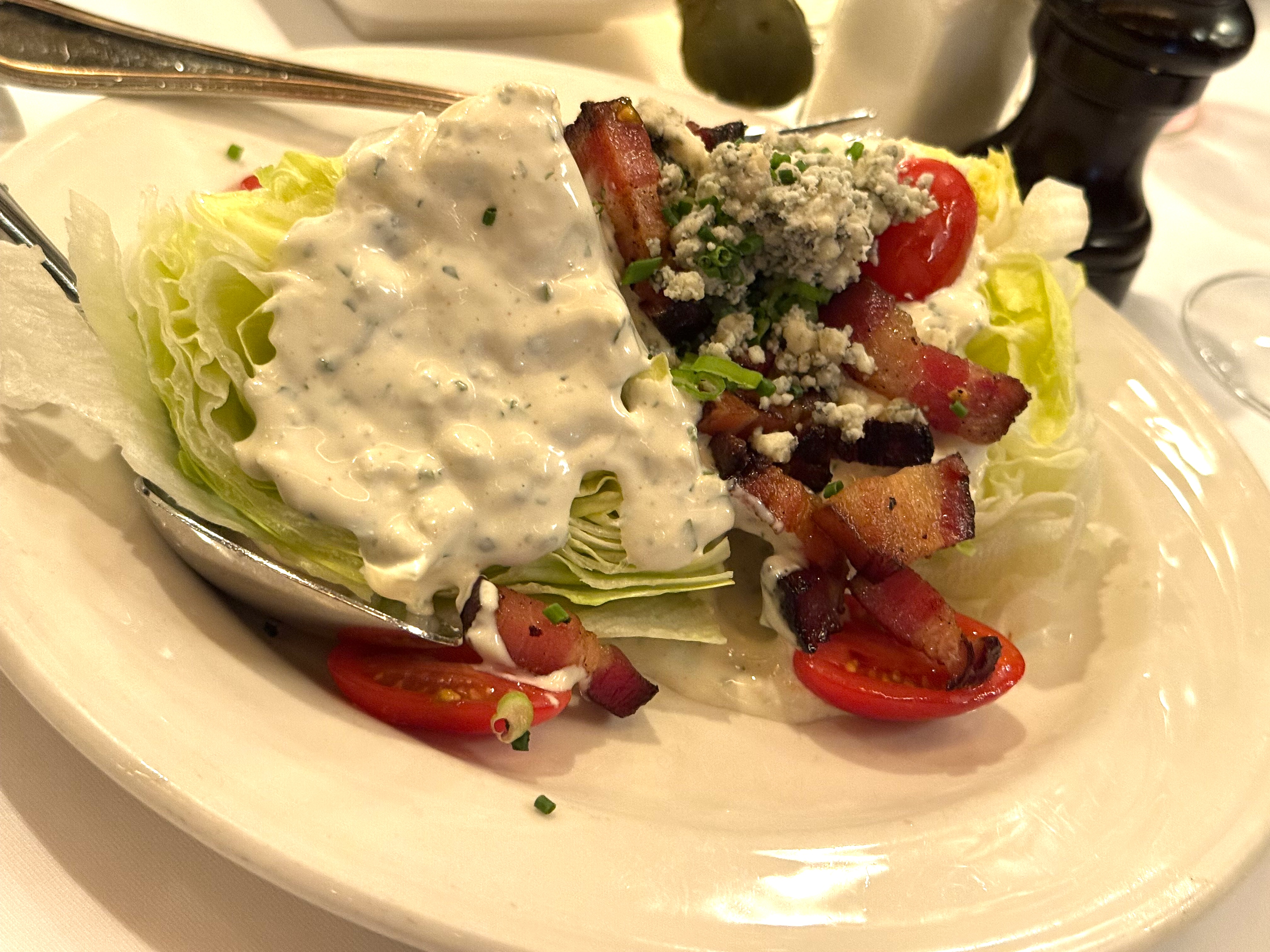 We split a dozen Oysters and also the classic Iceberg Lettuce Wedge salad with bacon, chopped tomatoes and bleu cheese: