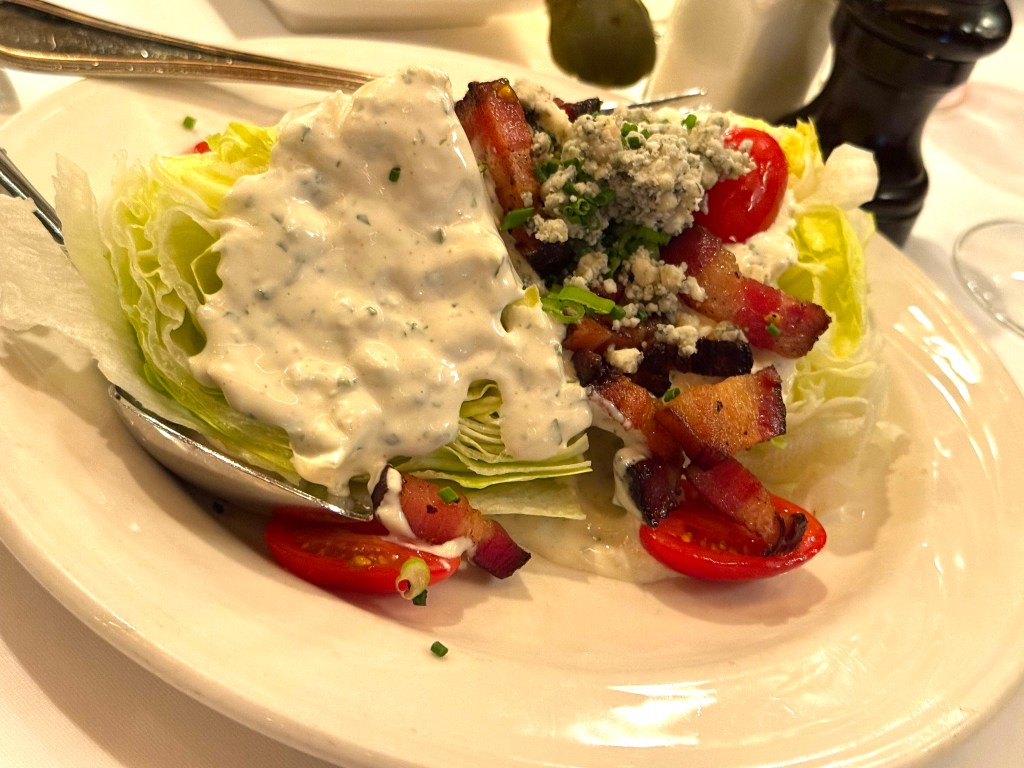 The Oysters were cold and fresh, served with lemon, cocktail sauce and vinaigrette – and the wedge is a favorite of mine: icy cold lettuce with thick smokey bacon!