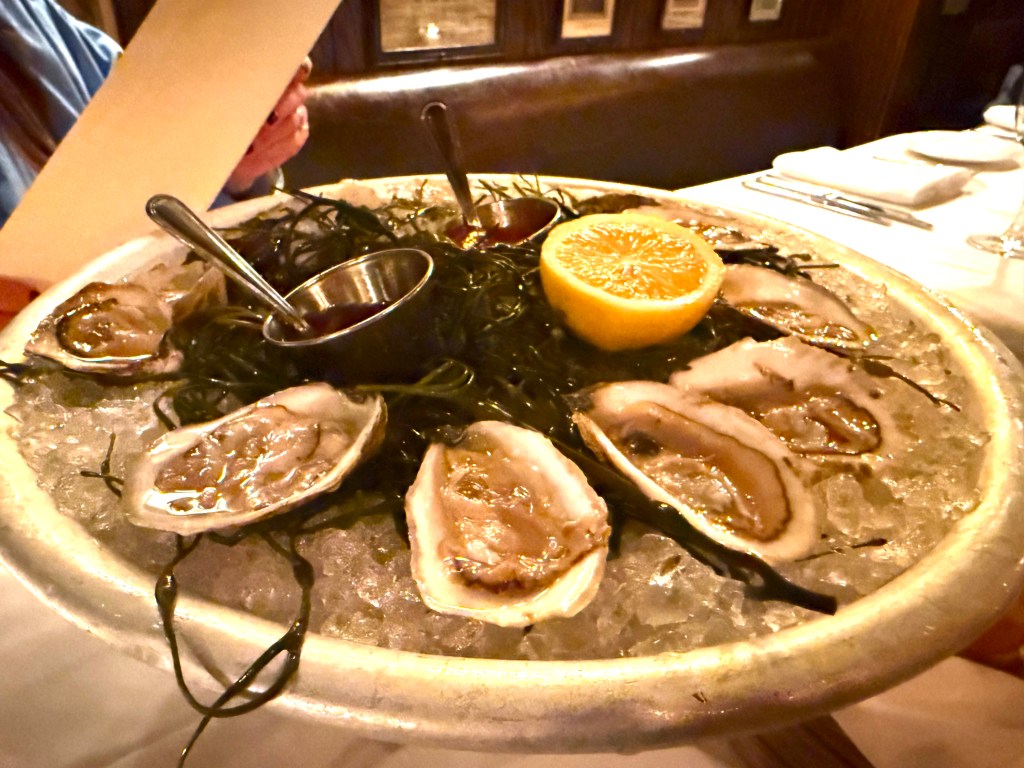 Let’s focus first on the appetizers: we ordered a dozen fresh oysters on this trip, and note that an order of “Lincoln’s Oysters” will deliver you either THIRTY or FIFTY shucked Oysters!