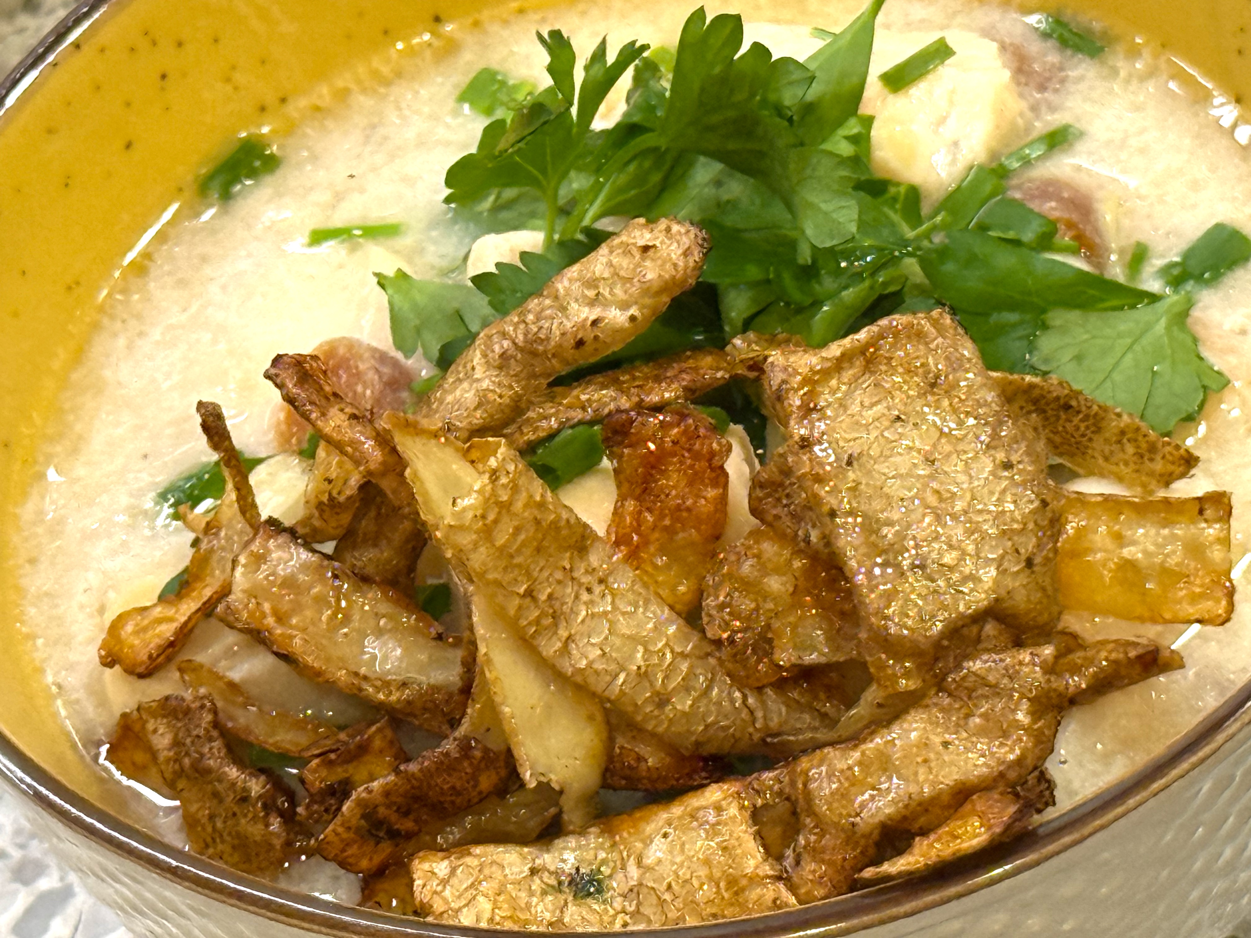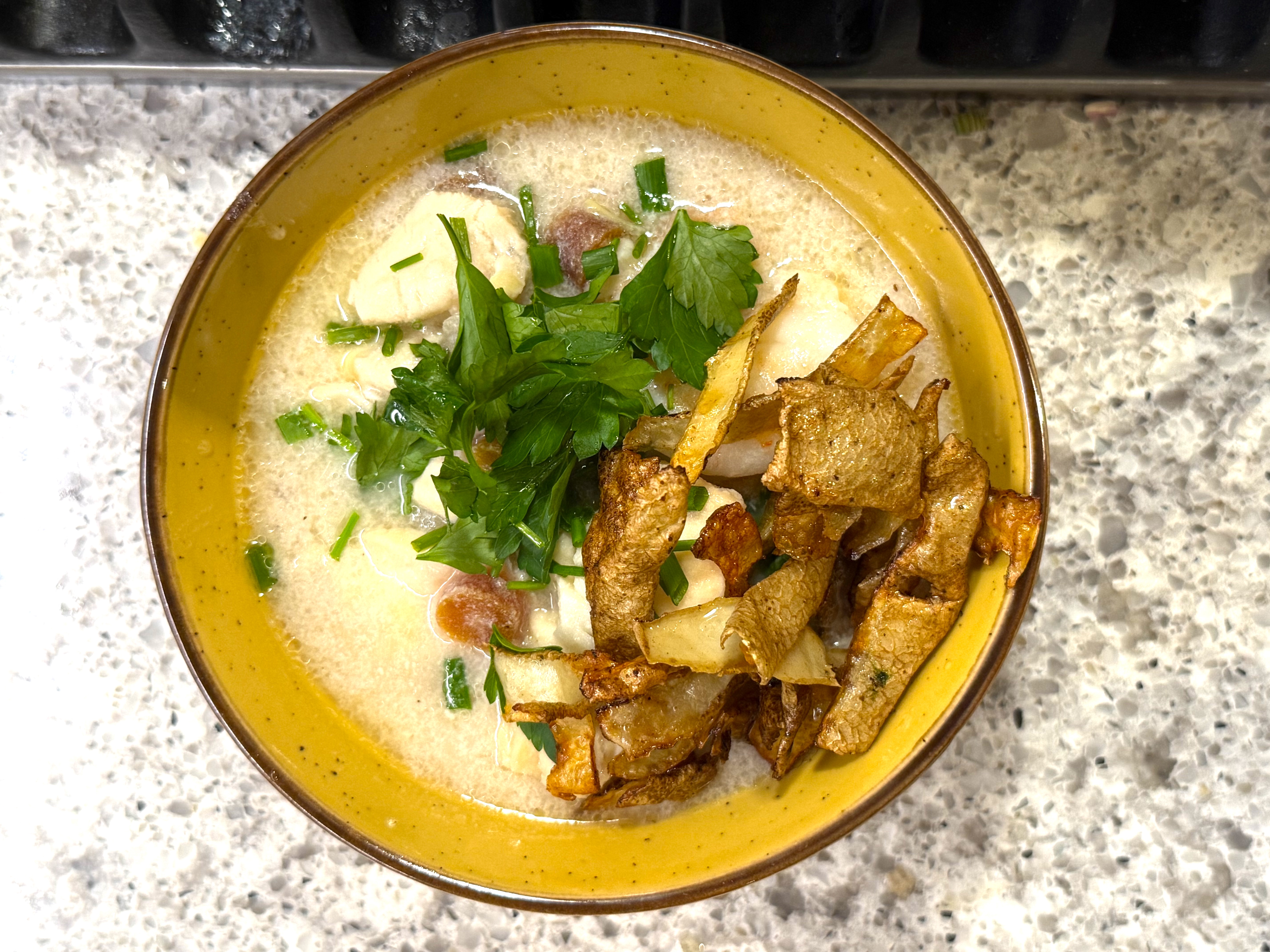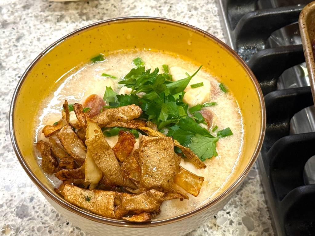 I’ve made a lot of creamy fish chowders, and this one was delicious….purely Scandinavian, but the addition of the Cristy potato skins really made the dish pop!