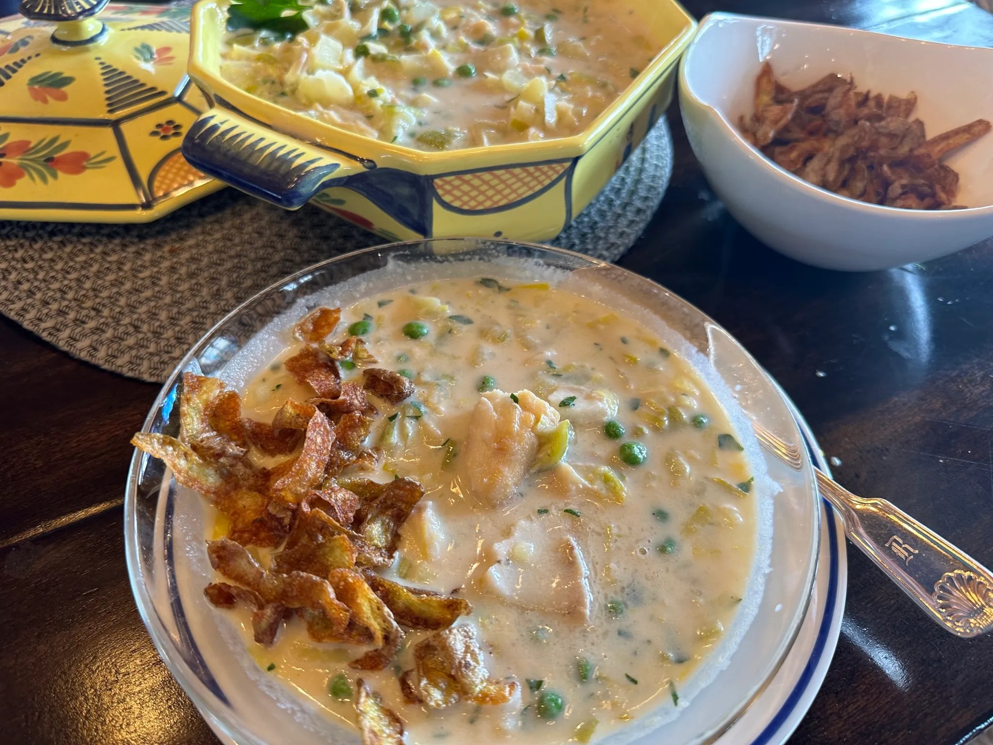 It was a purely Scandinavian fish chowder, but the potato skins came from Dorothy’s Scottish fish soup recipe…a global effort! Thanks as always for putting these on!