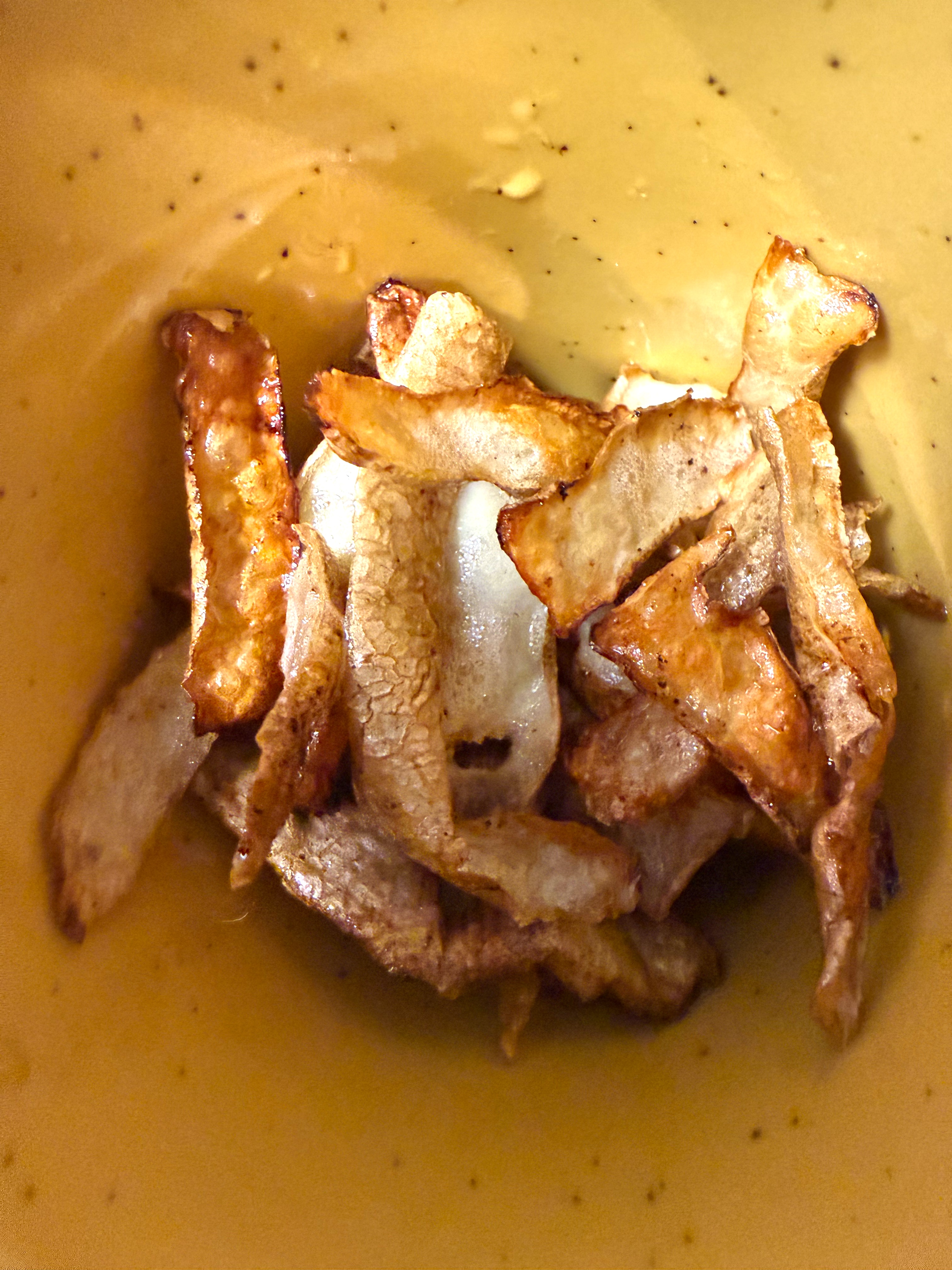 And those fried potato skins: a revelation! The skins of the potato hold most of the nutritional value, and they taste great too!