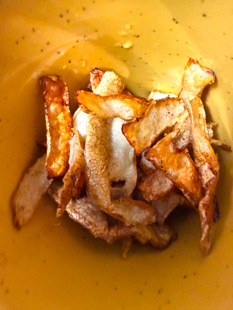 Yes, you just peel your potatoes – which will be added to the soup – and pan fry the skins in butter until crispy golden! Here they are again – you could even just eat these as a snack!
