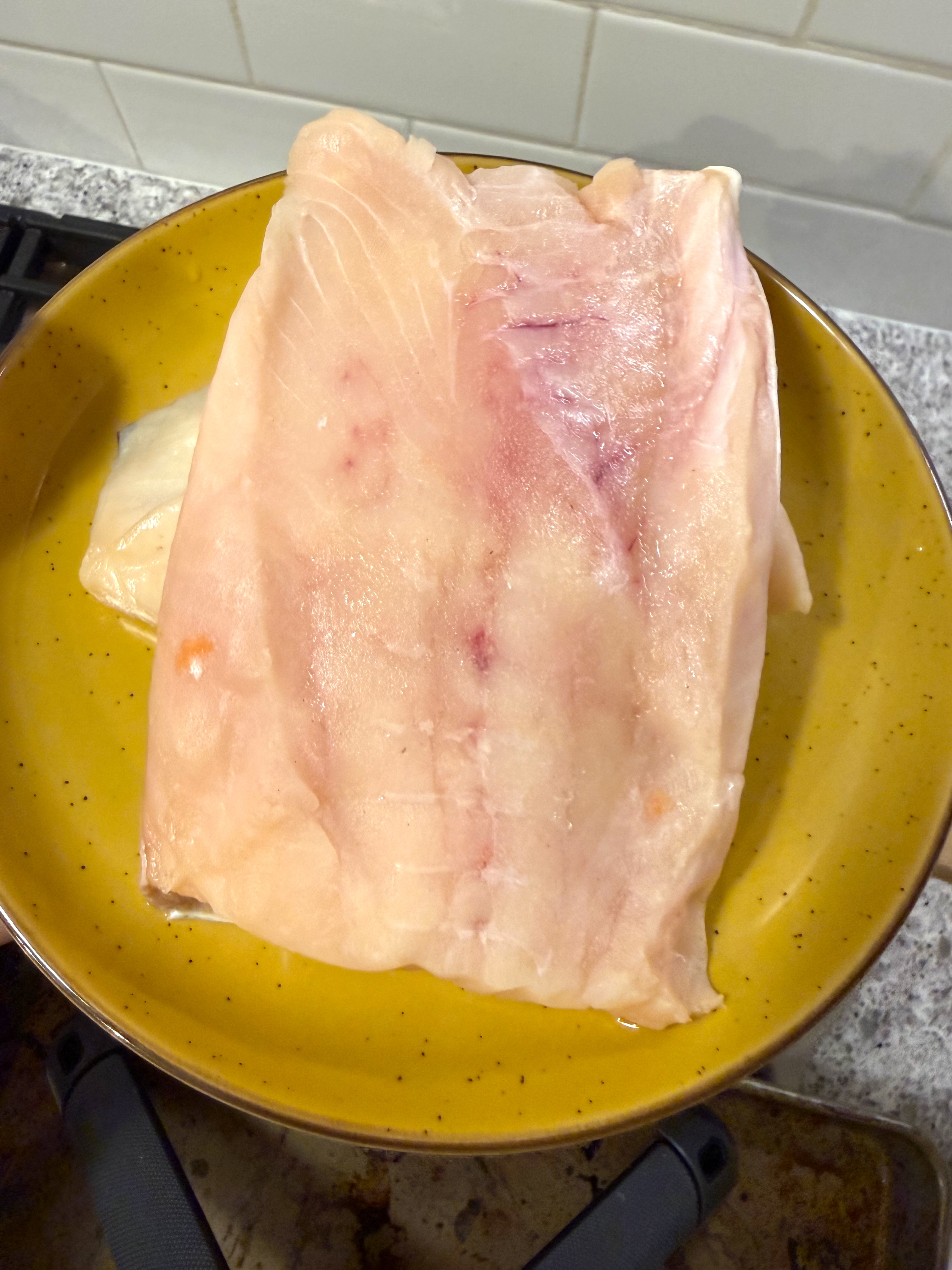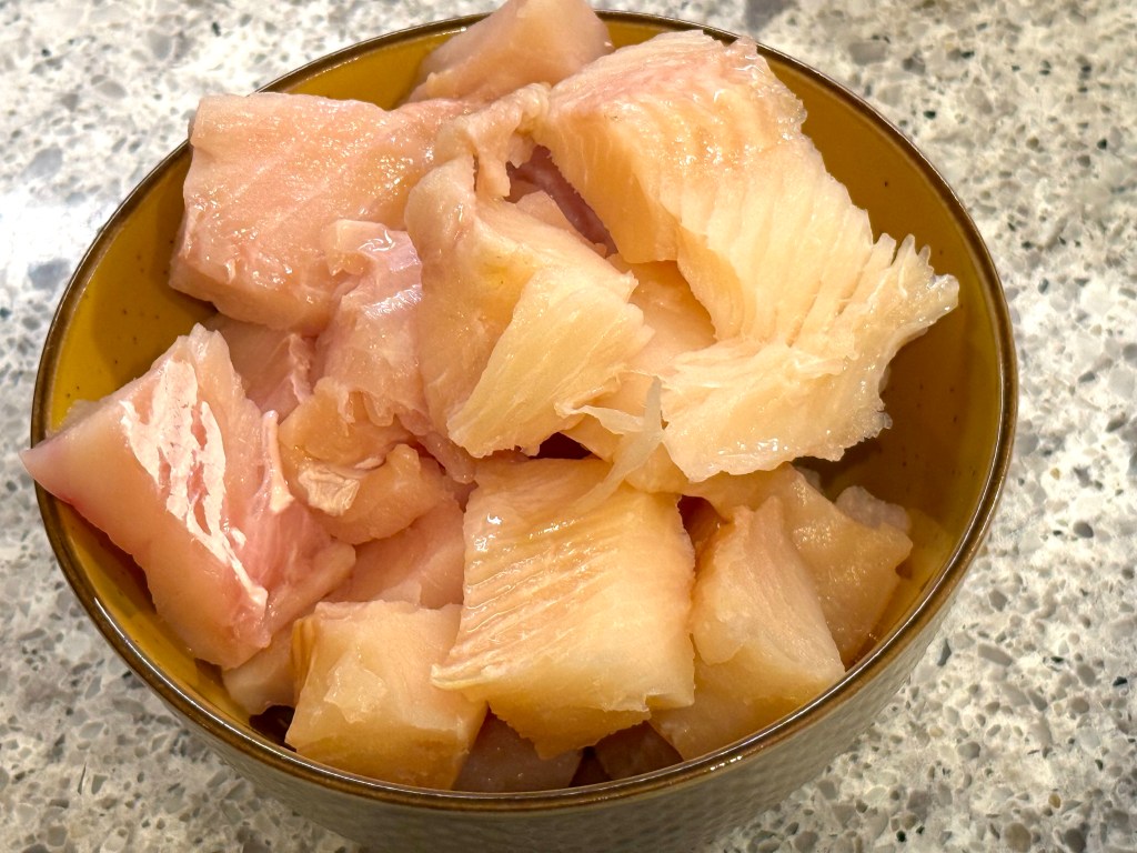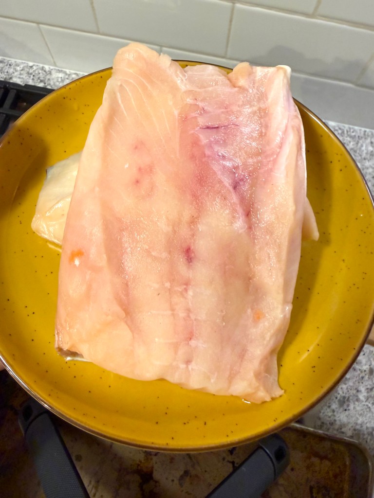 It begins with the fish, in this case one pound of Halibut that my son-in-law caught fresh in Alaska’s icy waters…you can also use salmon or cod as well…