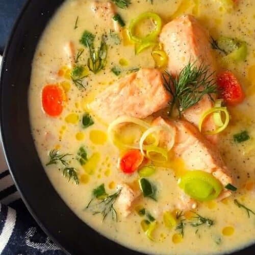 See this Scandinavian fish chowder? It’s often called “Fiskesuppe“: a rich, creamy soup featuring local fish (like salmon, cod) and shellfish (shrimp), combined with root vegetables (potatoes, carrots, leeks) in a buttery milk/cream broth.