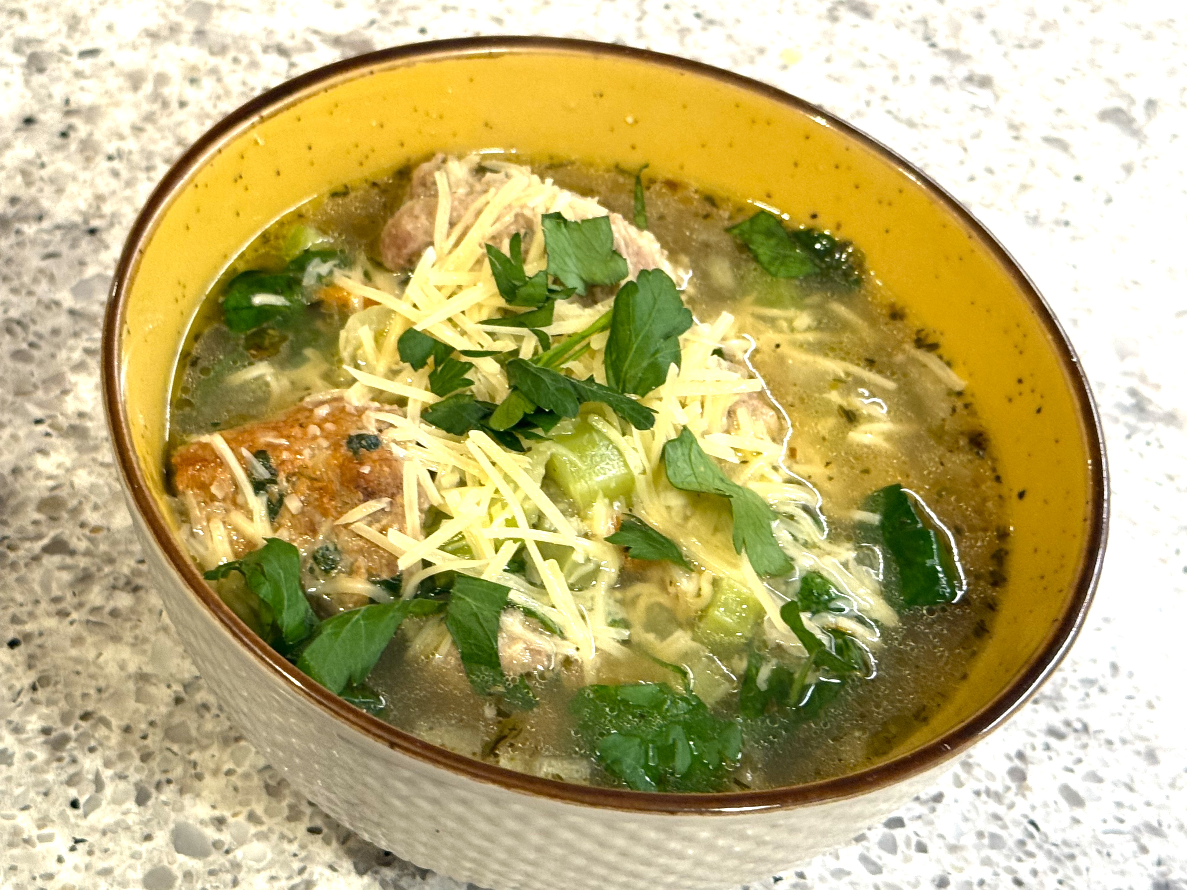 I was very happy with the flavor of the soup: the broth was rich, and the mini-meatballs are indeed the perfect marriage – add the spinach and the bite of the parmesan cheese and it was a very nice balance of flavors.