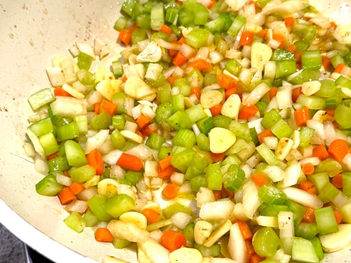 Add the onions, carrots, and celery and soften over medium heat for 6 minutes, until softened. Add a splash of olive oil during cooking if needed.