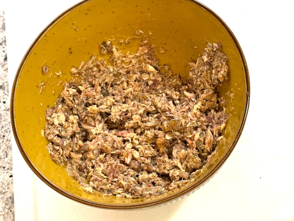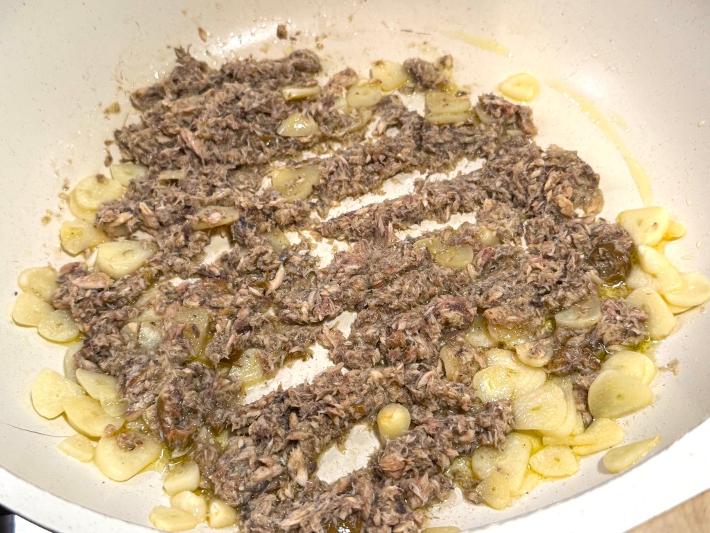 Here’s where I deviated from the recipe: I couldn’t find Anchovy paste but did find a tin of fresh Anchovies, so I just mashed them up and used them that way!
