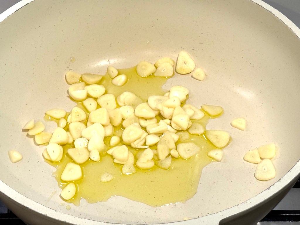 Next up, add your diced garlic to a pan with olive oil…