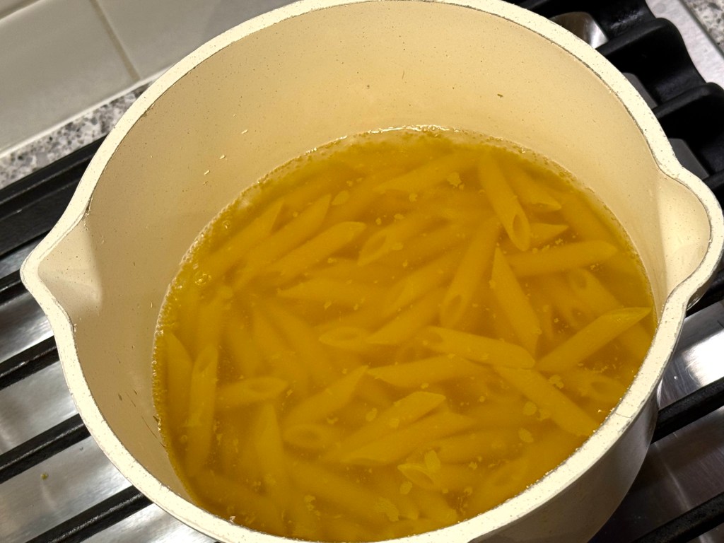 In a large pot of boiling salted water, cook the penne rigate until al dente, 10 to 11 minutes. Scoop out and reserve 1 cup (240 ml) of the pasta water, which I placed in a bowl.