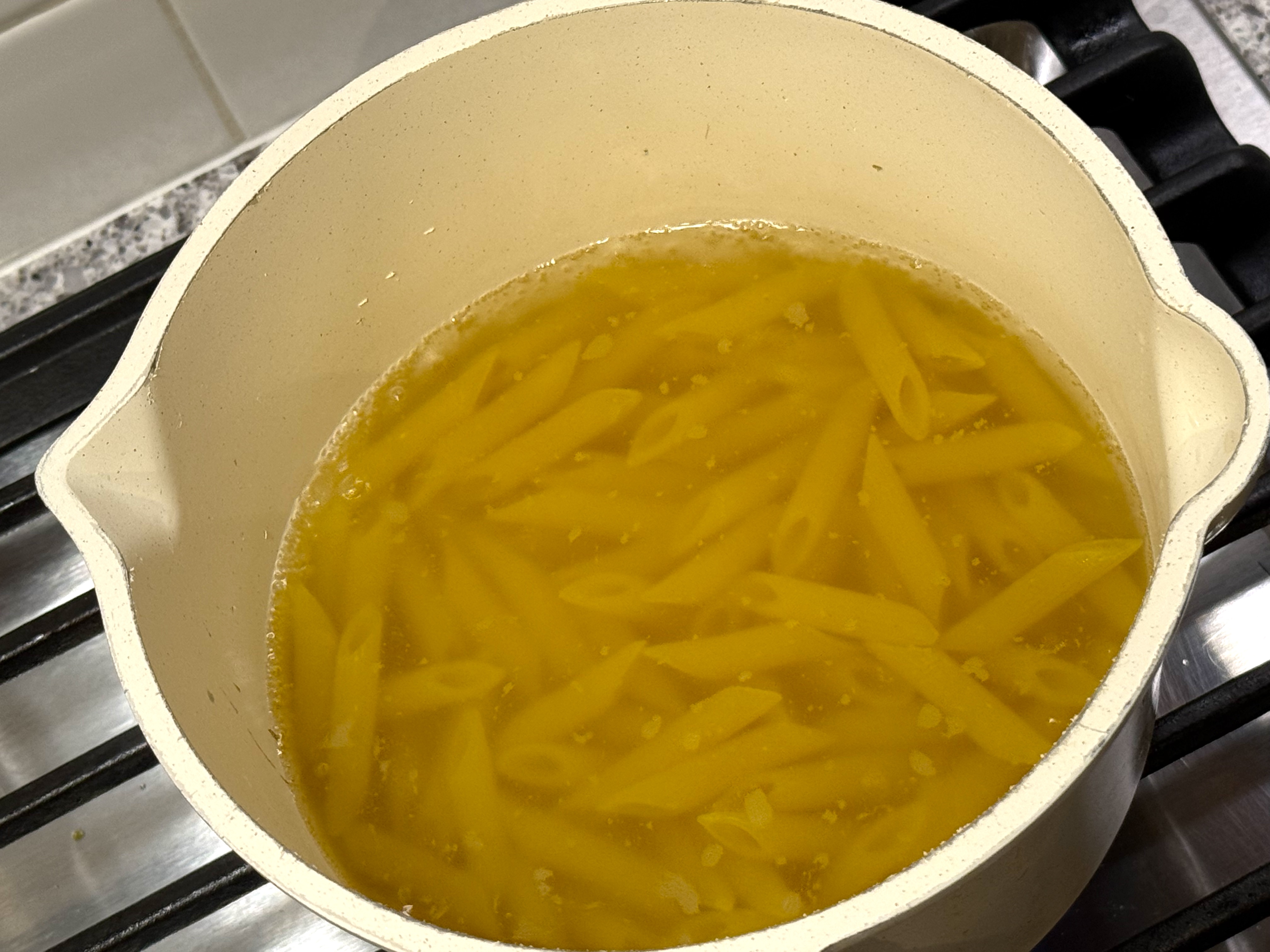 In a large pot of boiling salted water, cook the penne rigate until al dente, 10 to 11 minutes. Scoop out and reserve 1 cup (240 ml) of the pasta water, which I placed in a bowl.