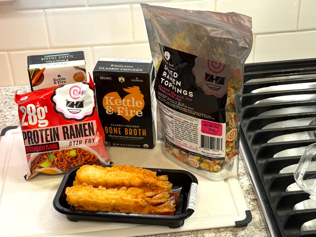 I took the dried ramen, the dried ramen toppings, and matched them with some beef bone broth…you can use miso as well…my only addition will be some tempura shrimp. Here’s what happened next: