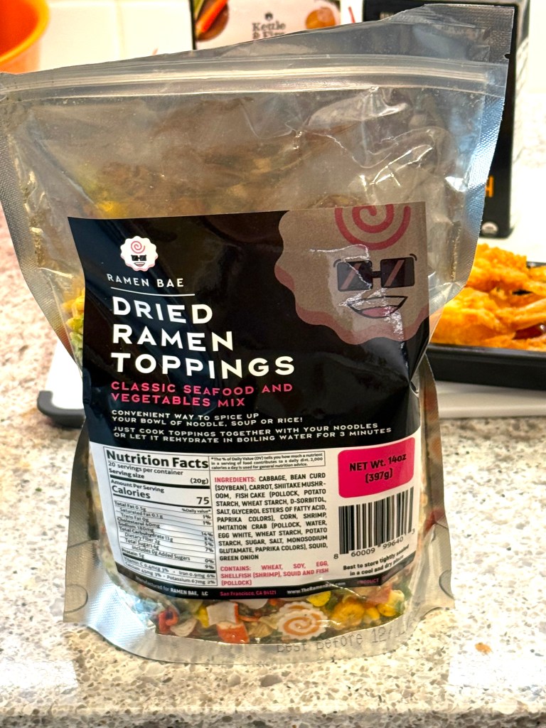 I saw an ad for this product and decided to give it a try: what shows up is a large package of freeze-dried ramen toppings as you can see – and if you watch this video, you will see what I plan to do with it!