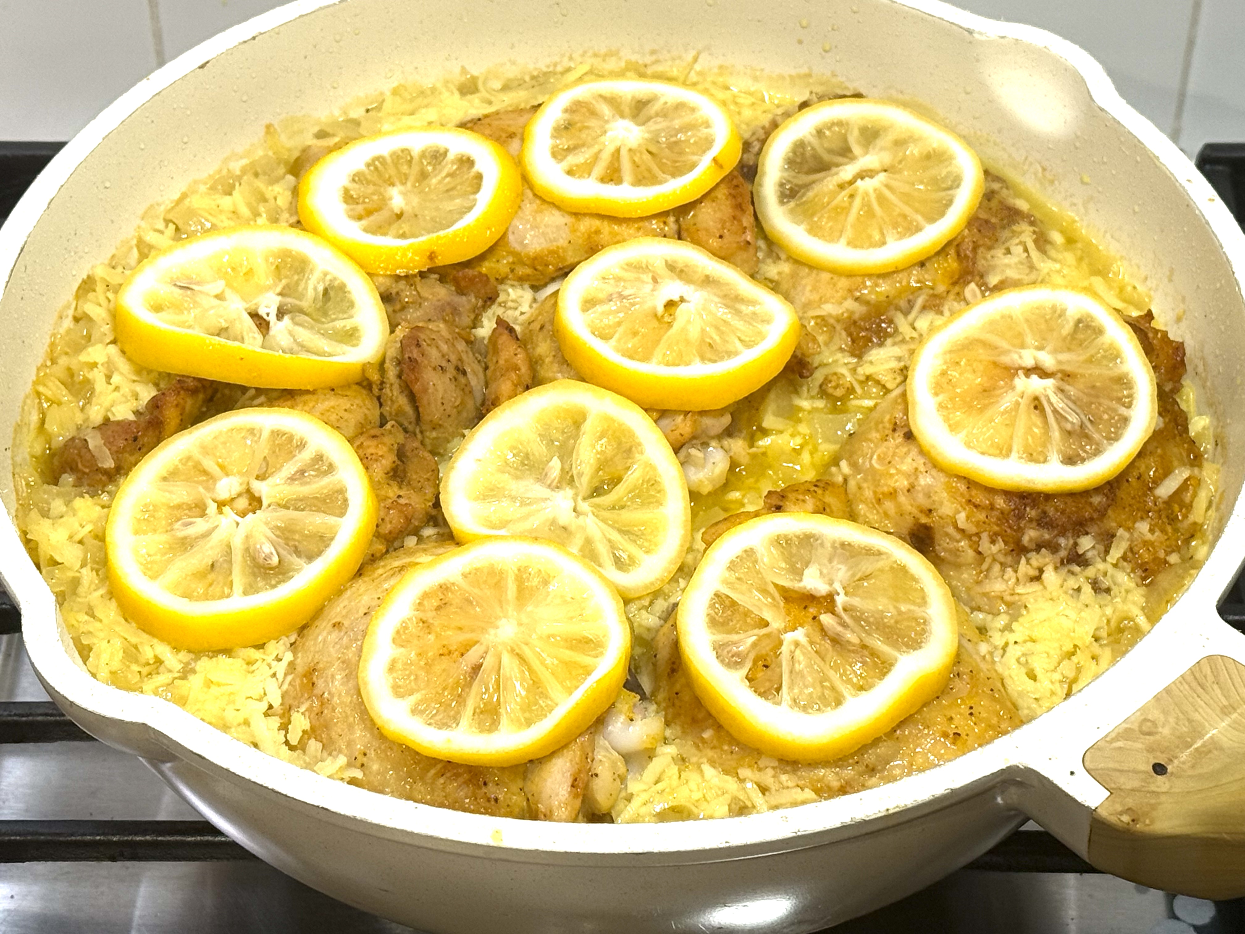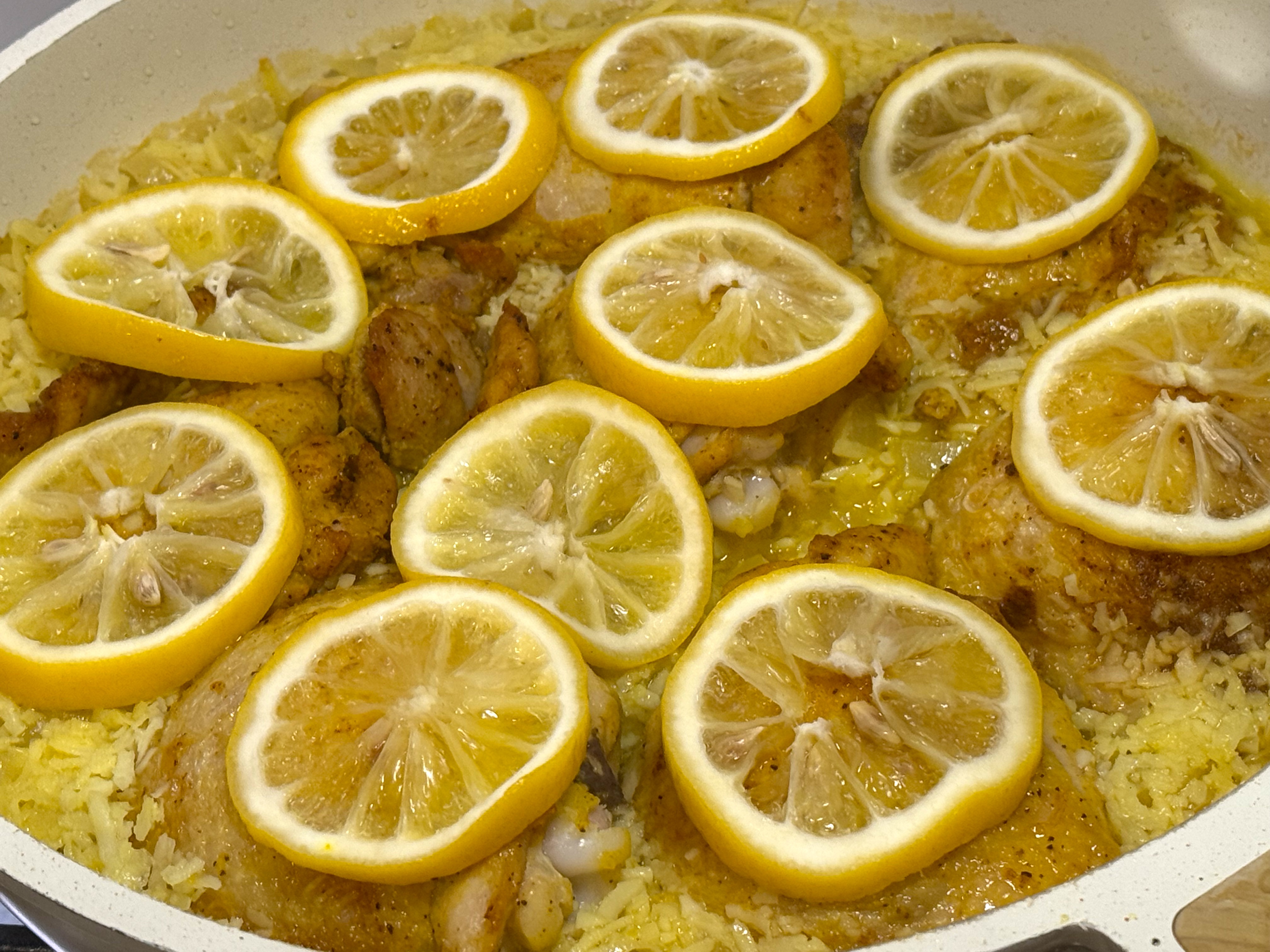 One last thing: add lemon slices to the top of the chicken pieces, bring to a simmer and cover with a lid. Place in the oven for 15 minutes.